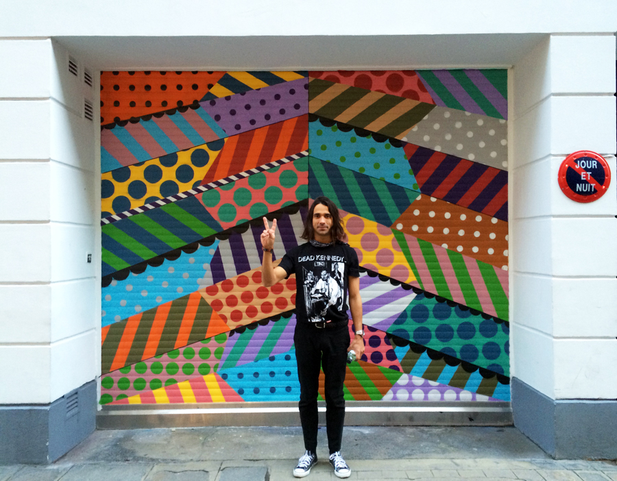Jason Woodside is a New York based painter whose colorful, large scale works have graced exterior walls in New York City, Los Angeles, San Francisco, Sydney and Paris. Commissions and collaborations include colette, adidas, Saatchi&Saatchi, Haydenshapes, WeWork, Obey Clothing, Faberge, the New Museum and Jeffery Deitch. As a native Floridian, Woodside’s work has been inspired by the natural environment of his origin—particularly the energy of the sun, sea and the land. Mixing bands of kaleidoscope pattern within geometric structures is Woodside’s signature aesthetic.