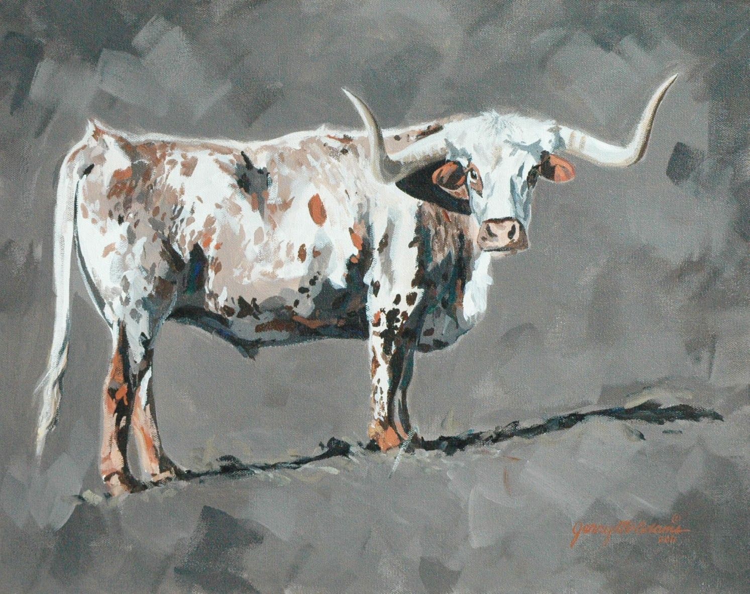 Jerry McAdams is one of the best known contemporary western artists in the country, especially in horse and ranching circles. His work has been featured on dozens of national magazine covers including The Cattleman, Gulf Coast Cattleman, America’s Cutter, Ruidoso and NCHA Sale Catalogs, as well as featured in Cowboys & Country, The Western Horseman, The Dallas Morning News, Fort Worth Star-Telegram and many other publications. A native Texan, McAdams lives on a small ranch with his wife and son south of Hico, Texas. After more than 30 years in the publishing business, McAdams’ art business has evolved from a lifelong hobby and sideline to a serious business. The popularity and demand for his unique and graphically bold western paintings have finally forced him to become a full time artist. A 1973 graduate of Texas Christian University with a degree in journalism, McAdams has won numerous writing, photography, and advertising art awards, including two National ADDY Awards from the American Federation of Advertising. His large scale paintings (36” x 48” is a typical size) are varied and sometimes whimsical, but maintain a photographer’s perspective in dramatic cropping and depth of field. Working mainly in acrylics, his subjects range from contemporary scenes of horses, cattle, and ranches to portraits of family pets. His artwork has been marketed and exhibited on a limited basis for more than 35 years in the Southwest. His paintings hang at The University of Texas and in galleries and private collections from California to Wyoming to Illinois to Connecticut, Kansas, Florida, Canada, England, Australia, Germany and across Texas, Oklahoma, Louisiana, and the entire United States.
