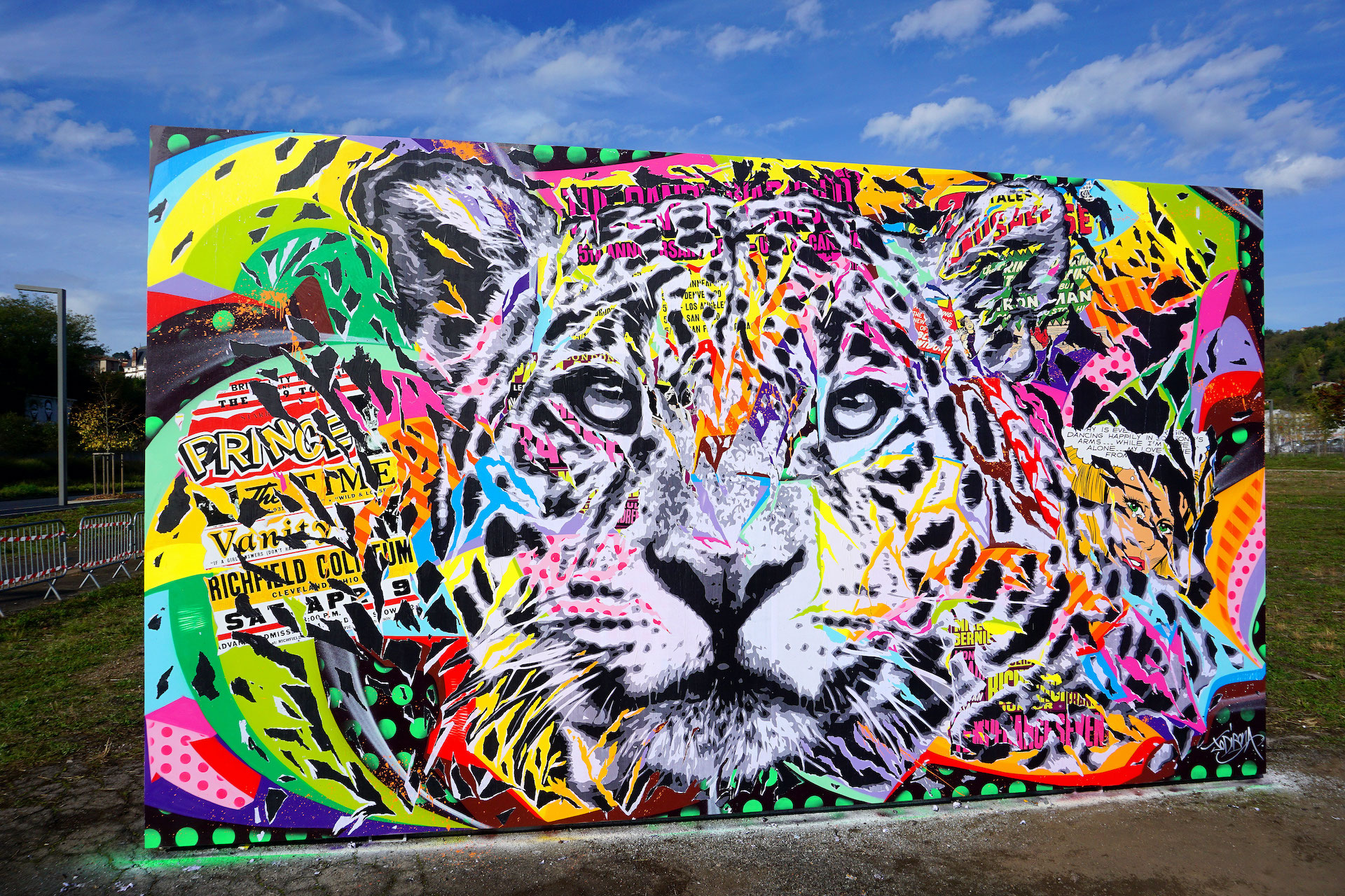 Jo has transformed his parents garage on the outskirts of Neuilly-Plaisance into a ‘creative den’ strewn with lids, cardboard and posters and it is in this workshop that he creates his masterpieces. He sees it as an anchoring to his roots and he believes, without a doubt, that it is this that allows him to grow his uniqueness, positivity and humility. Since his days of vandalism, the artist has never stopped refining his style and technique, in search of an iconic and hopefully ‘popular and accessible’ style. From festivals to galleries and walls to canvases, he decorates his surfaces with current graffiti, to be enjoyed by all ages and have an impact on all audiences. The work by the street artists Pure Evil, Dain and Charlie Anderson inspired him to explore portraiture through work based on colour, relief and movement. He also takes inspiration from popular imagery and is most drawn to the emblematic faces recognised by the general public. These include American film stars (Grace Kelly, Steve McQueen), important historical figures (Mandela, Angela Davis) and cultural icons such as Bowe, Gainsbourg, Mona Lisa and Yoda. He is inspired by ‘glowing beauties’, feminine figures and faces of anonymous children with shy and mistrustful gazes. His striking works are ceaselessly filled with colour and life, even when experimenting with images of wild animals. Through his technique of ripping – or uncovering – the artist gives depth and movement to his creations.