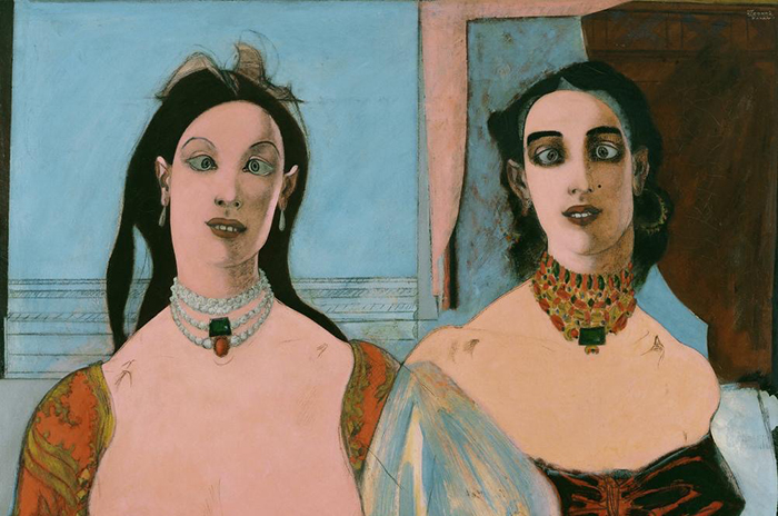 By the early 1940s, Graham had turned primarily to portraiture and self-portraiture, developing an idiosyncratic and allusive late style more connected to Old Masters like Poussin and Raphael than to the Abstract Expressionists he counted among his friends. Graham’s late paintings are characterized by the crossed eyes and flat presentation of the figures and by symbolic surface embellishments drawn from astrology, alchemy, and the occult.