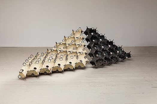 John is one of the most innovative and intellectual sculptors of the postmodern era. He explores complicated materials, constructions and techniques with the motivation of an Einstein mixed with the brilliant alchemy of idea and creation. All of the sculptures in this show were cast in urethane resin. I was fascinated to learn that their subtle and sensuous colors derive not from the paint tube but rather from the resin and other industrial materials. The colors can range within a single sculpture from dense, coal-like blacks to wax-bean yellows to a whitishness that is nearly transparent, like a patch of ice. Some of the pieces are coated in what appears to be a mossy green patina –which, Duff explained to me, has nothing to do with bronze and everything to do with Turtle car wax, which the artist uses liberally in the casting process. Since 2006, John has been honored with over 18 One Man exhibitions in prestigious galleries in the U.S. as well as 23 group exhibitions.