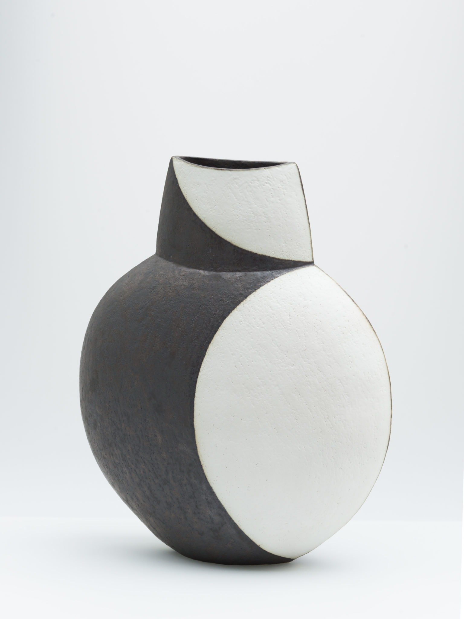 The leading hand-builder John Ward was born in 1938, and trained at Camberwell College of Arts in the 1960s. He is one of a number of significant modern potters to have concentrated on the pared down individual vessel form, most particularly the bowl, as a touchstone for exploration. His generally simple work has been augmented by more complex structures, the shapes cut and altered, perhaps with abstract, geometric decoration and cut-away rims that give some of his pieces an architectural quality. In addition to urban surfaces, his work evokes honed natural forms, the kind of bonier, elemental landscape he has lived in since he moved close to the Welsh coast in 1979. His best pots speak eloquently of the limitless language of the bowl and globular jar, their sculptural and metaphorical resonances.