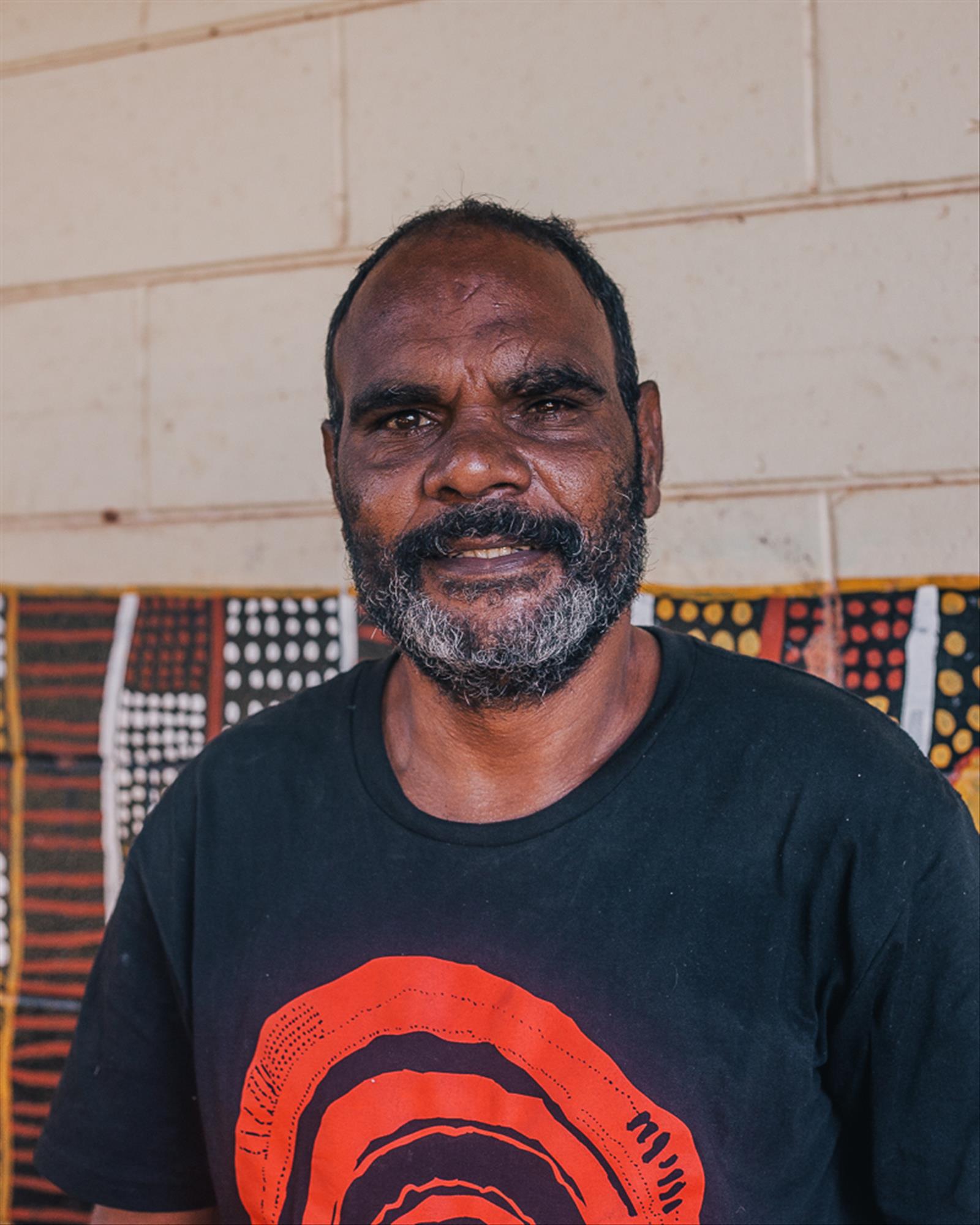 I grew up here in Milikapiti and have lived between here and Borroloola, up and down. My Father is from Borroloola. I was working there at the cattle station as a stockman, my Aunties station, herding horses and cattle. My Uncles held the Western law and Aboriginal law. When they passed away I inherited it. Some is secret. I hold the Western and Aboriginal law in my hands for all mankind to be equal. I hope my artwork gives a glimpse into my strong beliefs of a want for world peace and equality for all mankind. They call me ‘world peace’, as I have to balance both laws. I want peace in this world, I want the children to have food and water and all that. For Tiwi people, I want culture to be strong. For my future, there is more painting to come, more ideas. I paint with dripping, using black charcoal, white, red and yellow ochres down the canvas. It’s my own style, my own idea. I have three kids, all grown up now. I am a grandfather already, I have two grandchildren, one is in WA.
