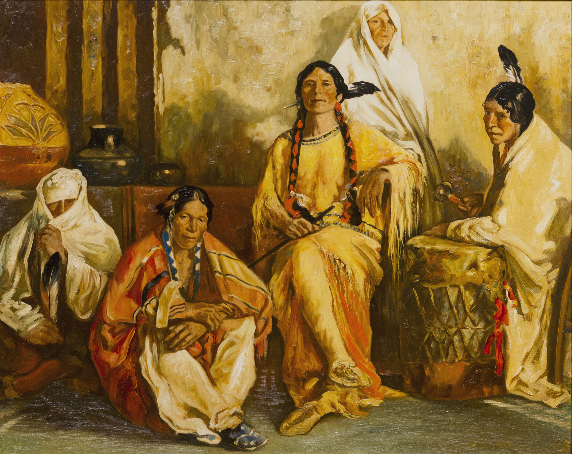 Still showing aesthetic curiosity, Rolshoven ventured to Northern Africa in 1910 and later executed a series of Tunisian paintings. The University of New Mexico has his Tunisian Bedouins (see Ackerman, 1994). Rolshoven fled France during the war years (1914-18). He visited the Panama-Pacific International Exposition in 1915 where he exhibited an Italian scene. The painter remarried a year later and discovered another exotic area, Taos, New Mexico, where he set up a studio and painted Southwestern Indian themes, for which he is well known. Rolshoven was elected an associate of the Taos Society of Artists in 1917. Two years later, he revisited Florence but returned to Taos regularly until his death in New York City, on December 7, 1930. There was a certain classicism in Rolshoven’s late period, for example, Donna Tosca, exhibited at the NAD in 1926. The elegant pose brings to mind the statuesque sitters of Sir Joshua Reynolds and the tight brushwork seems to represent a new direction for a former “Duveneck Boy.”