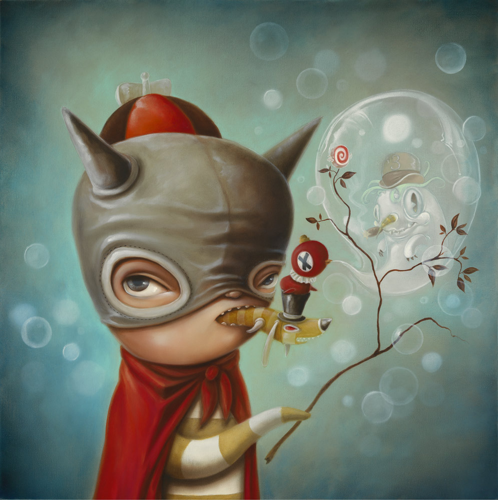 Kathie Olivas is an internationally exhibited multi-media artist from New Mexico. Through her current body of work, the Misery Children, she explores society’s insatiable desire to assign ‘cuteness’ and our discomfort with the unknown. A dark blend of early American portraiture set in post-apocalyptic​ times, Kathie’s paintings and custom toys are a satirical look at how fear affects our sense of reality. One of the central questions raised in Kathie’s work is that of ‘what if’: what if these ‘cute’ creatures had their own agenda? Are they attune to something beyond our understanding, or are we simply too cowardly to acknowledge it? Are their misshapen limbs and plated mouths a deformation from living in a desolate wasteland, or perhaps an adaptation for protection? The Misery Children are meant to evoke a nostalgic reaction that reflects isolation, fear and uncertainty, yet they also act as empowered alter egos. While these characters explore their new lonely worlds, they double as our narrators. They guide us through their reality as they experience it and yet, even in their company, we are granted no reassurance.