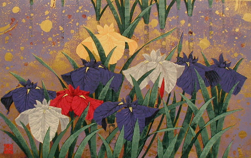 Kazutoshi Sugiura has created his own distinct, layered style of silkscreen printing. His work focuses on flowers, in particular the iris and peony. Sugiura was born in Kyoto and attended the Kyoto College of Fine Arts. Showing exceptional talent as a student, he was commissioned by the International Graphic Art Society in New York to do an edition of silkscreen prints. After graduating in 1963, he spent four years studying classical Japanese painting and the art of gold leaf restoration at the Kyoto National Museum of Antiquities. The use of gold leaf and rich saturated colors has become the hallmark of his art and brings to mind the art of traditional Japanese screen painting. He uniquely applies the gold leaf to the paper prior to the silkscreen process. This gives his works a textured, three dimensional quality that adds to his dramatic, yet intimate, compositions. His designs have an immediate appeal and are timeless, elegant and serene.