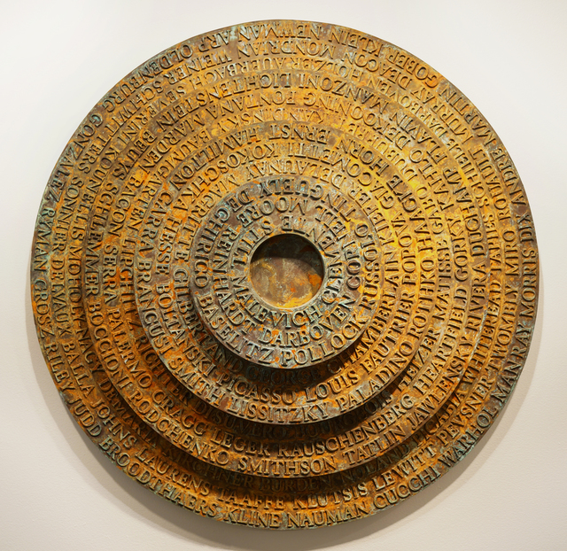 A prolific sculptor, painter and installation artist, Keith Milow was born in England (1945), lived and worked in New York for fifteen years and now lives in Amsterdam. Milow’s unique sculptures are seemingly made from solid metals and glowing with rich patinas of rust, verdigris or oily black. These monumental reliefs, many of them with raised letters spelling out Milow’s personal selection of names from the 20th-century pantheon of famous artists, continue his synthesis of minimalist forms, almost painterly mottled surfaces, classical and industrial architecture references and postmodern textual/conceptual strategies. Most of the pieces, which are actually fiberglass and resin coated with an iron (or occasionally copper) wash, consist of shallow concentric tiers embossed with rings of names spelled out in capital letters. The objects invoke a time when fine detailing was obligatory for every product from manhole covers to ornamental finials. The illusionist metal surfaces given to the sculptures are made of artificially oxidised metal powder and evoke the transience of even the most lasting materials. Milow’s objects are beautiful and impressive in their scale and precision, and are fitting monuments for modernism: artificial but still substantial. Selected Public Collections include: Metropolitan Museum of Art, NY, Museum of Modern Art, NY, Solomon R. Guggenheim Museum, NY, Tate Gallery, London, and the Henry Moore Foundation, UK.