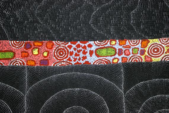 The Kelly Family Collaboration has members: Lily Kelly, Dolsi Kelly, Georgina Kelly, Christine Peterson Nangala, Topsy Peterson, ""Christine Peterson Nangala is from Papunya Community (3 hours out of Alice Springs in Central Australia). Christine comes from a family of artists with her mother being Topsy Peterson Napangardi and her aunt Lily Kelly Napangardi. Christine is a talented emerging artist. Her paintings represent the landmarks of her sacred land """"Sand Hills"""" like her famous aunt Lily Kelly Napangardi. Many landmarks are important to the Dreaming creation stories.” Dolsi Kelly Nangala is an exceptional Indigenous Australian artist from the remote Mount Liebig community, also known as Watiyawanu in the Northern Territory (325km west of Alice Springs). Dolsi is the daughter of the world-renowned artist Lily Kelly Napangardi who mentored Dolsi on how to paint and passed on her secret women’s business and Dreaming stories. Dolsi and Lily still maintain the nomadic lifestyle and travel vast distances around Central Australia to visit family and sacred sites on their land. The theme of Dolsi’s paintings is “Sacred Rock Holes” executed in a very contemporary abstract style. Dolsi paints mostly in all black and white or duel tones in the dotting style, similar to her mother. “ Lily Kelly Napangardi (1948) is an acclaimed Aboriginal artist from the remote Haasts Bluff community “Ikuntji” in the Northern Territory (227km west of Alice Springs). Lily lived with her family at the settlement of Papunya, where she was influenced to start painting during the emerging Desert Art movement in the 1970's. She was also encouraged by her husband Norman Kelly, also a successful artist. Lily is a respected senior law woman of her community of """"Watiyawanu"""", and the custodian over the Dreamtime stories associated with country. Since the 1980's, Lily's talent has been recognised by many art prizes. She won the Northern Territory Art Award for Excellence in Aboriginal Painting in 1986 and was a finalist in the Telstra National Aboriginal and Torres Strait Islander Art Award (NATSIAA) in 2003. She was named as one of Australia’s 50 most collectable artists by Australian Art Collector magazine. The subject of Lily’s paintings is the sand hills (Tali) in and around her land. They are usually executed in white dots on a black background. Lily’s innate sense of composition creates the illusion of movement of sand falling across the sand dunes. Today Lily Kelly Napangardi's art is recognised as some of the most innovative in the contemporary Aboriginal art scene. It is highly sought-after by museums and private collectors worldwide.” Topsy Peterson was born in 1955 at Papunya, Northern Territory. Topsy is sister to Denise Reid Napangardi and fellow artist Lily Kelly Napangardi, and mother to renowned artist, Christine Peterson Nangala. While growing up, Topsy's mother Easia Naparulla taught her all about their dreaming, in particular """"spring flowers"""" dreaming, however not until the death of her mother in 1983 her older sister Lilly Kelly shared with Topsy other family stories that had been handed down to her, including """"Sand Hills"""" Sand Hills has become Topsy’s most renowned art style. Using mostly rich crimson colours of yellows and reds she paints in the famous Papunya dot style, which form waves, bends and fields that portray a resemblance to her home’s natural landscape. It is the landscape that signifies her connection to her family’s dreamings, which she has passed on to her children, particularly to her artist daughter, Christine Peterson. “ Georgina Kelly Napaltjarri is the daughter of Dolsi Kelly Nangala. Georgina is married to Abraham Philips who is the grandson of well-known artist Long Jack Philips. Georgina resides at Mt Liebig, approximately 325kms west of Alice Springs. The stories Georgina paints have been handed down to her by her mother Dolsi and grandmother, Lily Kelly Napangardi. Georgina paints the sandhills called ‘Tali’. Her works encompass intricate dot work, perfectly conveying the sacred sand hills of her country, passed onto her via generations of dreaming. “