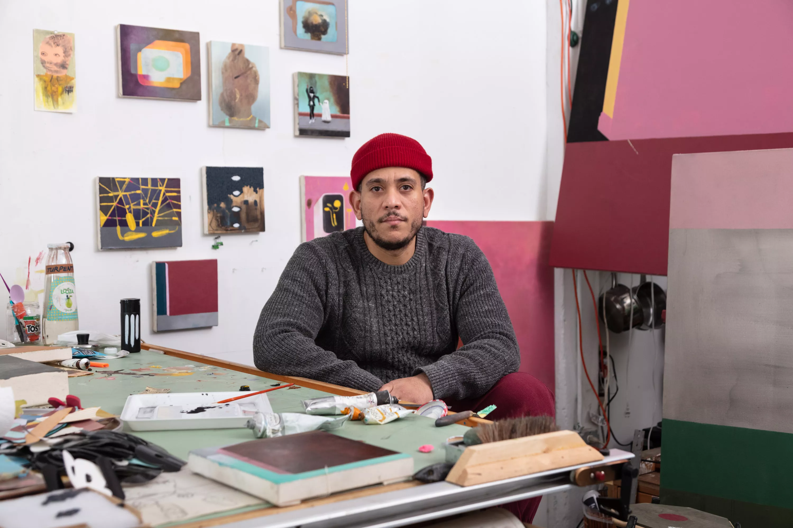 Kenny Rivero (b. 1981, New York; works in New York. MFA Yale 2012, BFA SVA 2006.) Rivero’s work, which spans paintings, collage, drawings, and sculpture, explores the complexity of identity through narrative images, language, and symbolism. His aim is to deconstruct the histories and identities he has been raised to understand as absolute and to re-engineer them into new wholes, with new functions. His creative process allows him to explore what he perceives as the broken narrative of Dominican American identity, socio-geographic solidarity, familial expectations, race, and gender roles. Rivero cites the hybrid qualities of salsa, hip-hop, house music, jazz, and merengue—as well as Vodun and Santeria, which were present in his daily life growing up—as core influences on his decision-making in the studio. Kenny Rivero's work is represented in notable public collections including The Baltimore Museum of Art; The Studio Museum in Harlem, New York, NY; El Museo del Barrio, New York. NY; The Whitney Museum of American Art, New York, NY; Collection of Thomas J. Watson Library, The Metropolitan Museum of Art, New York, NY; The Nasher Museum of Art, Durham, NC; Crystal Bridges Museum of American Art, Bentonville, AR; and Pérez Art Museum Miami, FL.