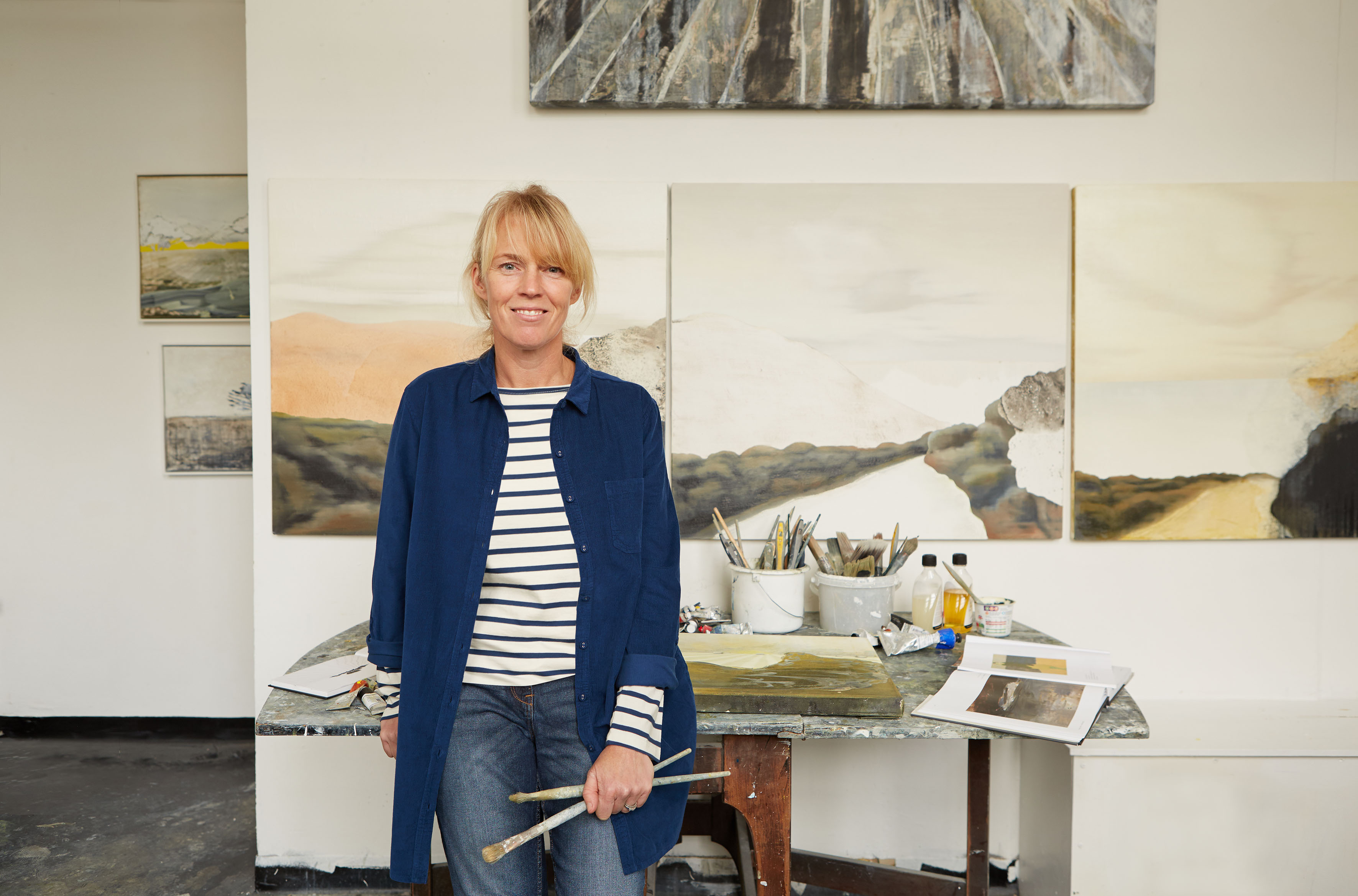 Kerry Harding’s landscape paintings are concerned with experience beyond the ordinary. In her practice she relies entirely on process and the manipulation of paint, working and reworking the canvas in an almost unconscious manner until that moment of enlightenment, that sublime moment of sensory response to abstract shape and colour, when the emerging image asserts its own meaning and direction on the artist. This is a notion of the sublime that precedes the finished image, bringing instinct and awe into the act of making itself. Paralleling, in some ways, the traditions of Romanticism, Harding’s images dismiss any picturesque ideas of the landscape in favour of creating a deeper connection with the viewer. Whilst the landscape around her home inspires her work, she seeks to take us from the familiar to the indefinite, playing with perspective and space in order to achieve some sense of ‘other’ or the sensorially weird.