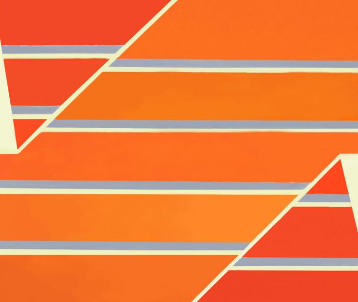 In 1965, he began the Scissors Jack Series in which he arranged opposing triangular shapes with inverted Vs of bare canvas at their centers that threaten to split their compositions apart. The Diamond Cut and Diamond Drill paintings followed. In these, Zox used regularized formats as a means of revealing how color can change our perception of shape. In a single work he often combined industrial epoxy paints with acrylic to set up tensions between colors that would not exist otherwise. At the time, Peter Schjeldahl observed in The New York Times: Zox “is one painter who shows an ability to play by the rules without cramping at all an essentially romantic and exuberant sensibility.” His art of the period was equated with that of Frank Stella and Kenneth Noland.