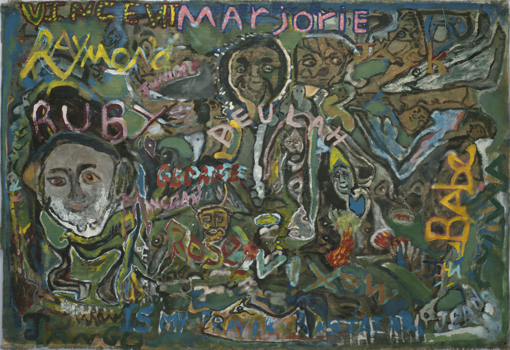 The Intuitive painter Leonard Daley was born in Point Hill, St. Catherine, in 1930. He started painting some time in the 1960s but no works have been preserved from before 1979, when he first came to the attention of the local artistic community. He came to national prominence in 1987, when his work was featured in the National Gallery’s Fifteen Intuitives exhibition. While his visionary, spontaneously abstract expressionist work was well received by aficionados of outsider art and Intuitive art, it proved controversial with those in the Jamaican art world who had more mainstream, academic tastes and could not appreciate his work as “art.” Despite this mixed response, Daley’s work was widely exhibited and collected, in Jamaica and abroad and ultimately received significant critical acclaim. It was included in several other National Gallery exhibitions, such as Intuitives III (2007) and is represented in its permanent collection. Daley’s work was also included in several noteworthy overseas exhibitions, such as New World Imagery (1995), an exhibition of contemporary Jamaican art which toured in the U.K., Caribe Insular (1996), a Caribbean exhibition which toured in Spain and Germany, and Redemption Songs (1997), an exhibition of Jamaican Intuitive art which was shown in the USA. Daley lived in the Liguanea area of Kingston when his work was first discovered in 1979, and subsequently moved to the rural community of Fidler Hill in St. Catherine, where his self-built house was a work of art in its own right with all surfaced covered with his paintings and sculptures. In the latter years of his life, he lived in the Jack’s Hill area of Kingston. He died in 2006.