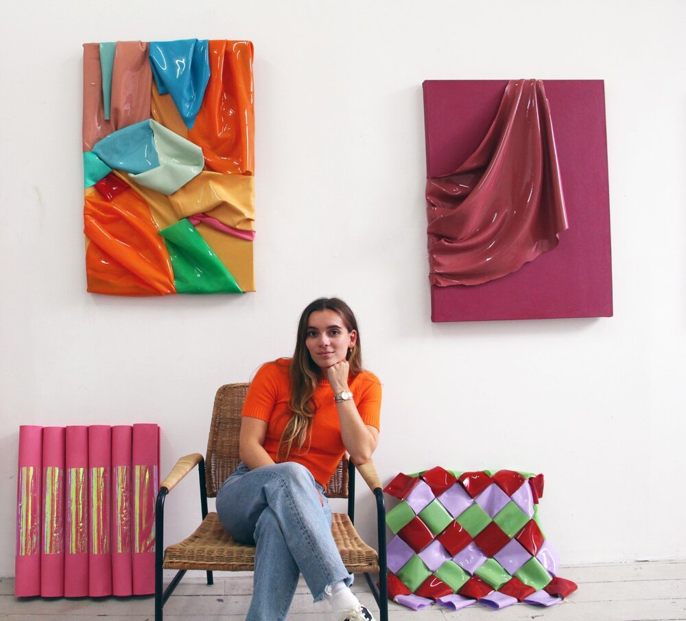 After studying fashion at Central Saint Martins, Manon Steyaert began her artistic practice with a deep understanding of textiles. The French-born artist, now based in London, also holds a master’s degree in fine art from Chelsea College of Arts. Steyaert manipulates materials like silicone, latex, and cellophane to look like draped fabric by pouring them onto canvas, then painting over the tactile forms in glossy shades of color. Steyaert’s eye-catching and tactile works challenge viewers’ perceptions by upending traditional distinctions between painting and sculpture.