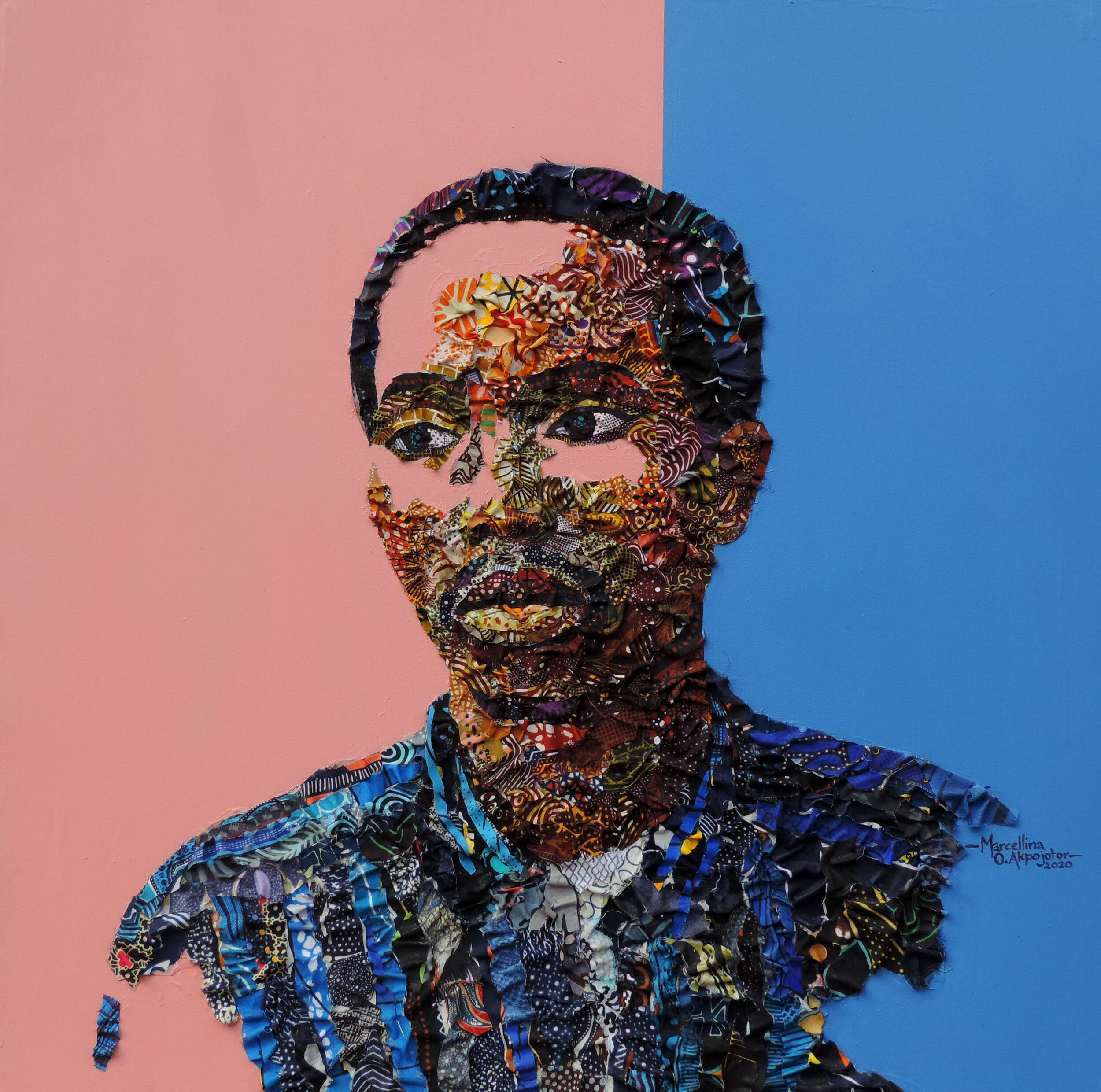Employing collaging and traditional painting techniques, Akpojotor produces richly textured and layered work with compelling visual imagery exploring femininity, personal and societal identity and issues surrounding women empowerment in contemporary society. Working primarily with discarded pieces of the Ankara fabric ─ sourced from local fashion houses ─ commonly known as the ‘African print fabric’ despite its Dutch origin, she investigates the politics of the fabric as a cultural signifier and a conduit for memory and shared energy.