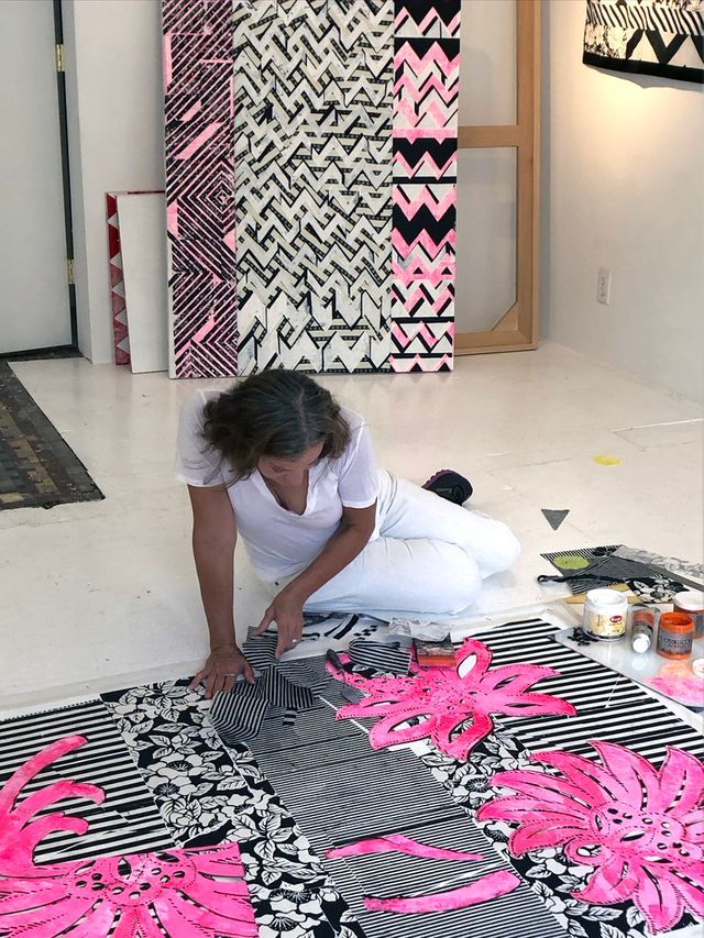 Lanzetta imprints her visual associations onto surfaces with varying mediums: silkscreen, stamping, digital technology, oil paint, enamel and acrylic. Intense hues of color chosen for their spiritual significance meld with geometric contours and single-motifs with insistent repetition. Textiles have become increasingly significant in Lanzetta’s work for their ability to act as cultural metaphors. Collaged textile panels overlaid with silkscreened patterns become her “canvases”, signifying the flexibility of identity in a modern, hyperconnected globalized world..