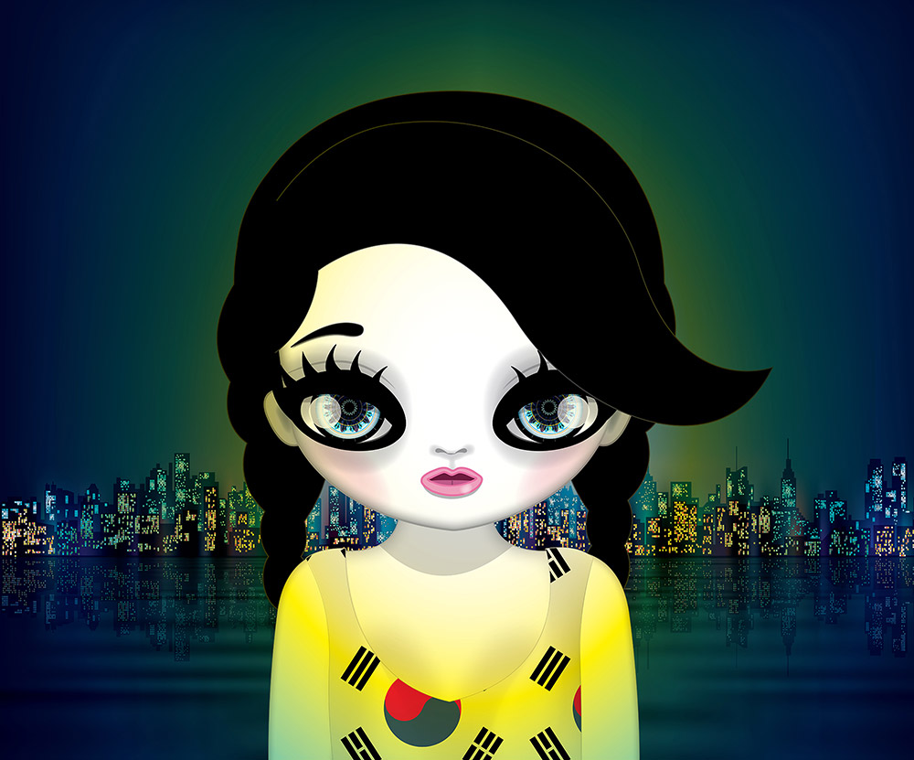 She trained as an animator in Australia before moving back to Korea and embarking on a successful career as a video director. This is where she developed her signature 'Eyedoll' characters. These distinctive images became the protagonists of her painting project.