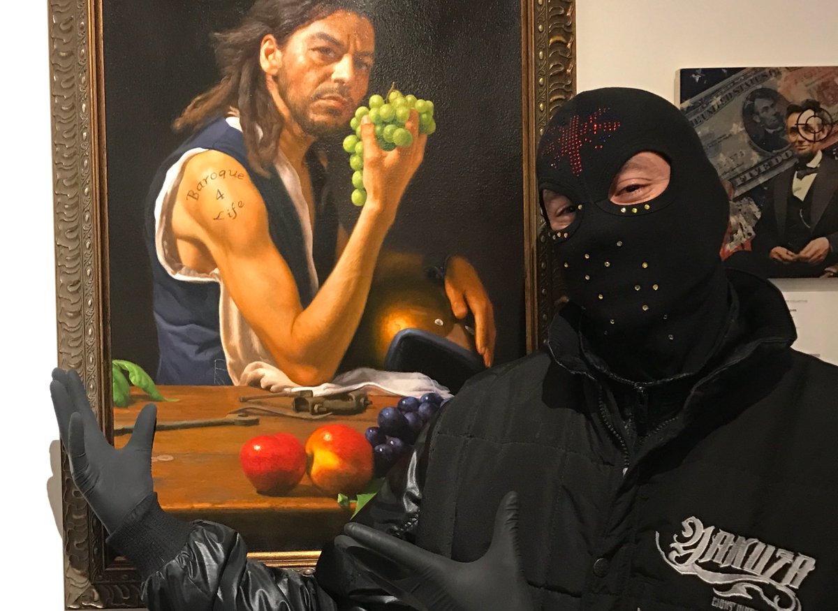 Mason is probably best known for his mask. It has become a trademark, hiding his identity whilst creating a mystique which helps with promotion and publicity. He began wearing it when in 2010 he said he was going to reveal the face of the artist Banksy in an oil painting. The whole campaign was nothing more than a big marketing ploy and it worked. The supposed unveiling of Banksy courted a lot of negative publicity and the occasional death threat. Nothing he hasn’t encountered many times in his previous life but he knew the fact that he was remaining anonymous would annoy Banksy’s followers even more. Secondly, in his previous careers he has met and dealt with some extremely dangerous men. There is no risk to his security but he would rather the two worlds never meet. Also he occasionally does freelance work and its better for him if he remain in the shadows so to speak. So the mask, apart from its marketing potential allows him to hide in plain sight.