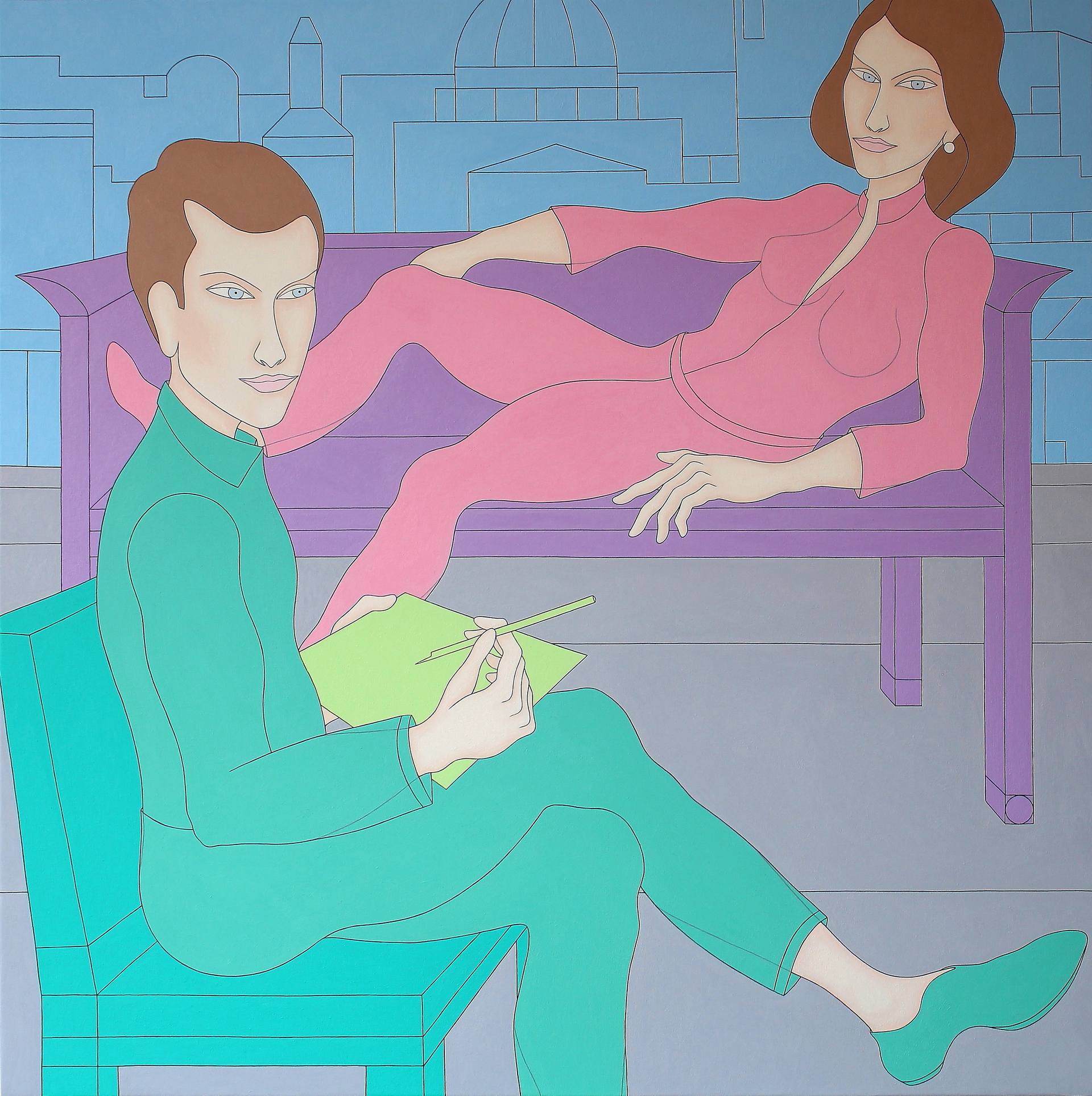 Nicola Leoni was born in 1971 in Brescia near Milan where he works. Graduate in Art History at Ca` Foscari University in Venice. He started off by painting in the 80`s. Nicola Leoni’s works are a representation of characters between cartoon and a surreal world; they are set in a motionless daily life, without relationship with people around, trivialized by media and overvaluation of mind as opposed to emotions. In his artistic production, the artist represents his characters in aseptic architectures, where the human presence fits mechanically in refined neo baroque perspectives. The characters’ gaze, in artist expression, contacts cynically one’s double: “We ourselves” who are looking at the paint. This is a result from scenic arrangement, like theatre scenery, which absorbs the viewer also with bright colouring. The sceneries show moments of daily life, fixed in complex images to decode. A strange established reality joins the observer in the painting, where the human being plays the starring role but without a soul saving ideology. Pop colour mixed together a poetic language gives birth to hypnotic and energy-giving paintings, with a perfect line, invading the environment and catching the observer in a positive manner. “It goes the way of the world” is the ironical saying of Nicola’s works which, with changing of the characters, point out the difficulty of changing our believes.