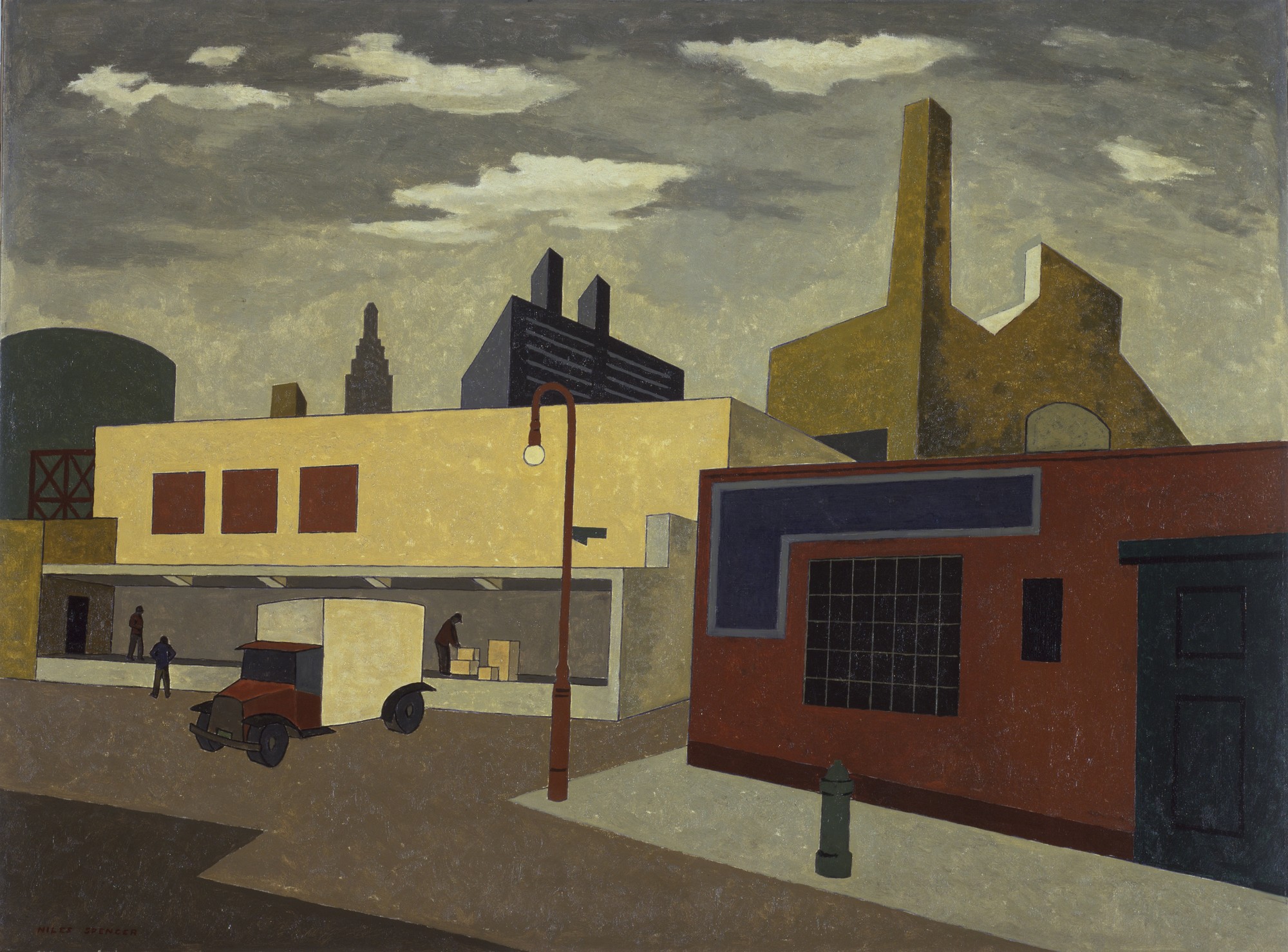 Niles Spencer, associated with the Precisionists and known for the simplicity of his architectural images, was born in 1893 in Pawtucket, Rhode Island. Spencer’s family owned a prosperous textile mill in Pawtucket and this early relationship with industry provided the artist with a subject that would fascinate him throughout his career. From 1913 to 1915, he attended the Rhode Island School of Design in Providence. Settling in New York in 1916, he enrolled in Kenneth Hayes Miller’s anatomy class at the Art Students League and studied with George Bellows and Robert Henri at a private art school in the Bronx. Spencer divided his time between New York and Ogunquit, Maine, where the he spent the summers with other modern American artists who had gathered around Hamilton Easter Field, painter, critic, and founder of The Arts magazine. During the early 1920s, Spencer traveled to Europe, where he was drawn to the art of both the Cubists and the Italian Renaissance painters. The planes of color and faceted forms of Spencer’s early still-life compositions are reminiscent of Cézanne, whose structured compositions seem to have affected Spencer’s architectural landscapes and the more abstract style that would characterize his mature work.