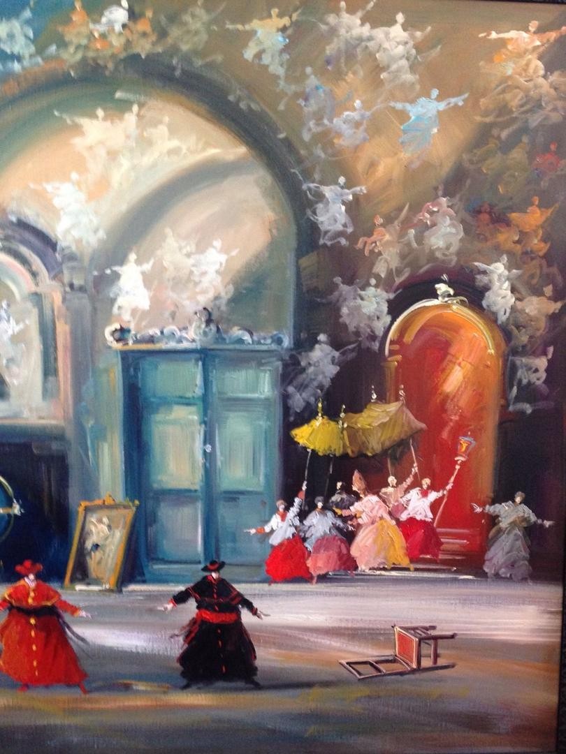 Martini, who is an opera singer, often repeats the scenography in the genre paintings; in particular in those where his altar boys, with scarlet tunics and white stoles, run like undisciplined children during play-time. His vibrating and splashing masterstroke is a technique he found during the research of the right way to express the moving of masses or the concept of escape towards free and large spaces.