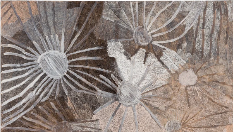 Ms N. Yunupingu lived and worked in Yirrkala, near Nhulunbuy in north-east Arnhem Land, and was a Yolngu woman with a rich artistic genealogy, including musicians Mandawuy Yunupingu of Yothu Yindi and Geoffrey Gurrumul Yunupingu, and the Gumatj patriarch and artist Munggurrawuy Yunupingu. Yunupingu’s art practice remains independent of bark painting traditions of the Yirrkala region/ Yolngu people of Arnhem Land. Yunupingu’s work is valued for the spontaneity and texture of her draughtsmanship. Her figurative and abstract works unleash a unique set of personal narratives revolving around her own experiences. She also employed unconventional materials such as texta-pen on clear acetate sheet, recycled paper and board during the dry season when the supply of bark runs low. While the impression is recognisably Yunupingu, the finish and texture create a fascinating reconfiguration of her distinct visual language.