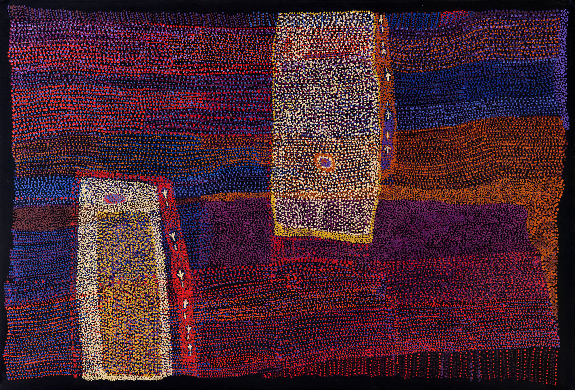 Patju Presley was born in the 1940s at Itaratjara, an important site between to the community settlement of Watarru and Kalayapitiin the Great Victoria Desert. He is a senior Pitjantjatjara Law man with great knowledge of the geography of the Western Desert and the associated Tjukurpa. His intimate knowledge of the country is directly related to survival in this beautiful but sometimes harsh environment learned from the generations of hisancestors. Connections between the Land, the provider offood, water and shelter and the Tjukurpa a spiritual understanding of the world are finely interwoven in his paintings, creating works of an elegant abstraction. Each work is related to a specific site and ancestral beings and is strongly based on his experience and perception of the Law and the Land. When he was a young child he lived a traditional lifestyle walking along Tjukurpa tracks that linked sacred sites and water sources. From the tjilpis (old men) he learnt the ways of life in the desert and Anangu social order, law, culture, Tjukurpa and ceremony. Patju first learnt aboutChristianity from Mr Wade, the missionary who came to the desert on camel preaching the Bible and giving out tea and damper. When the mission was established Patju spent sometime there learning English to read and write hymns and Bible stories. Patju trained to be a preacher at the mission at Ernabella. He isalso a strong cultural man who practices traditional cultural business and inma (ceremonial singing and dancing), carves punu (ceremonial and utilitarian objects )and hunts malu (kangaroo), kalaya (emu), kipara (bush turkey) and rabbit. Patjuresides at Tjuntjuntjara Communitiy with his wife Ivy Laidlaw. In his paintings Patju refers to many of the Tjukurpa of the country of the Great Victoria Desert including the Wati Kipara (Bush Turkey), Wati Kutjara (Two Water-Snake Men), Kalaya (Emu),Wati Pira (Moon Man) and Minyma Kutjara (Two Sisters). His images are visual representations of the epic journeys and creation stories of the country. References to important landforms, rockholes and Tjukurpa tracks implicitly evoke the tjukuritjabeings (of the dreaming), their interactions and activities. References to features inthe country by desert artists are heavily loaded with complex symbolic meanings and interconnected layers of cultural references.