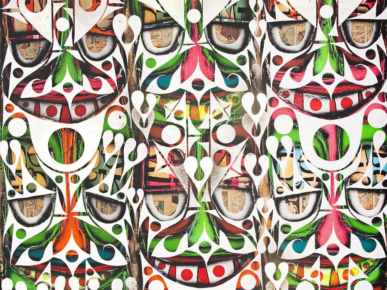 New York artist Phil Frost creates work that combines the raw, gritty edge of the street with an elegant, painterly aesthetic. Frost first became known in the early 1990s for his involved installations on the streets of New York. Locations were scouted, measured and analyzed for feasibility before he painstakingly created the artwork in his studio. Works, usually composed of numerous panels were then affixed to his targets under cover of darkness. In 1994, these street works inspired a PBS episode of City Arts featuring the artist. His transition to the gallery world was inevitable and after a string of strong showings in group exhibitions, he mounted his first solo exhibition at the Jack Shainman Gallery, New York, in 1999. His found object constructions and works on canvas are a multi-layered combination of colorful, almost comic-strip portraits and intricate typography overlaid with bold graphic symbols rendered, more often than not, in correction fluid. Words and slogans that are a hybrid of numerous languages, both real and imagined, are layered within the works to create compositions that are spiritual in nature, transmitting inner quickening as mantra or gestural prayer. His artwork has been featured on album covers for popular recording artists such as DJ Shadow and Sick Of It All. In recent years, Frost has continued to show his work in numerous exhibitions, including a second showing at Jack Shainman in New York (2001) and his first American museum exhibit at the Pennsylvania Academy of Fine Arts in Philadelphia (2002).