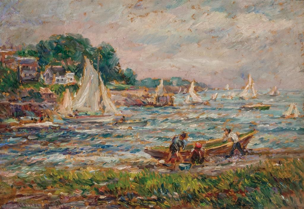 Reynolds Beal, the older brother of Gifford Beal, was born in 1867. He is known as one of the early American Impressionists. Beal studied at Cornell in 1885-89 with a focus in naval architecture. His more formal art training came from studying under William Merritt Chase in 1896. Circus themes were Beal's first endeavor from 1910-20. Although his naval training provided him with accurate and detailed knowledge of ships he took more interest in exploring the wind-controlled relationship between air and water. Yachting was also a hobby of Beal's, resulting in paintings of maritime scenes from Rockport to the Hudson and also the Caribbean. Beal worked in Bermuda in 1922 and 1939-40. Beal had his first solo exhibition at the Clauson Gallery, NYC, in 1905. He went on to become a founding member of the Society of Independent Artists in 1917. His palette was bright and lively and he traveled with other American Impressionist such as Ernest Lawson and Childe Hassam. He was truly able to capture seasonal qualities and air movement throughout his artistic career.