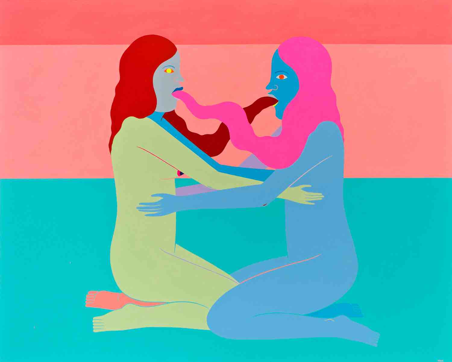 Richard Colman is an American painter which work is known for blending figurative imagery and bold geometry. Typically using symmetrical compositions, Colman explores themes of human sexuality, societal hierarchies, life and death. He vacillates freely between figuration and abstraction, at times focusing on pattern to such a degree that it overwhelms any recognizable components in his painting; other times he privileges figures and narratives. Also producing sculpture and installation works, Colman incorporates a variety of media, including pencils, paper, wood, porcelain, plaster, glue, nails, and tape—typically using vibrant colors.