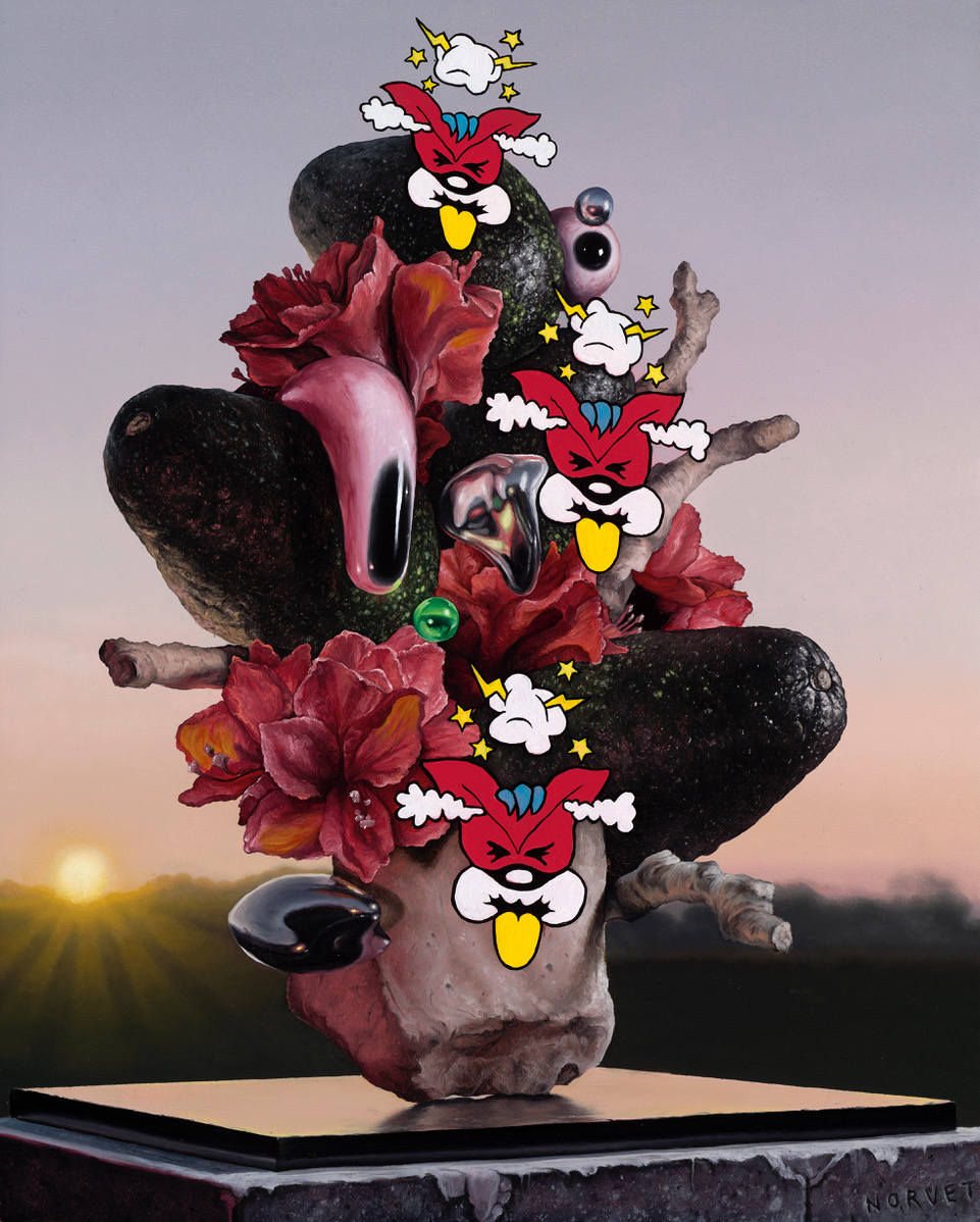 Sean Norvet is that rare — I would have said impossible — thing: a contemporary artist who seems to draw equally on Renaissance proto-surrealist Giuseppe Arcimboldo (he of the beautiful, horrific plant-people), on the exuberantly ribald cartoons of Robert Crumb and on the happy-go-lucky, barely cohesive LA of The Big Lebowski. His paintings are usually precisely executed in oils on panels, but his style and subjects reflect the media-saturated, commercialized environment we inhabit today. His work is often deconstructive and simultaneously jarring, intense, hilarious and disturbing. His work is sometimes explosive, sometimes still, and often mashes up elegant photo-realism with two-dimensional cartoon buffoonery. His three-dimensional sculptural installations, usually involving food, offer a satiric, ephemeral cheapness in which the medium is the message. As urgent and commanding as his images are, he playfully invites viewers in to share the laugh; he doesn’t preach.