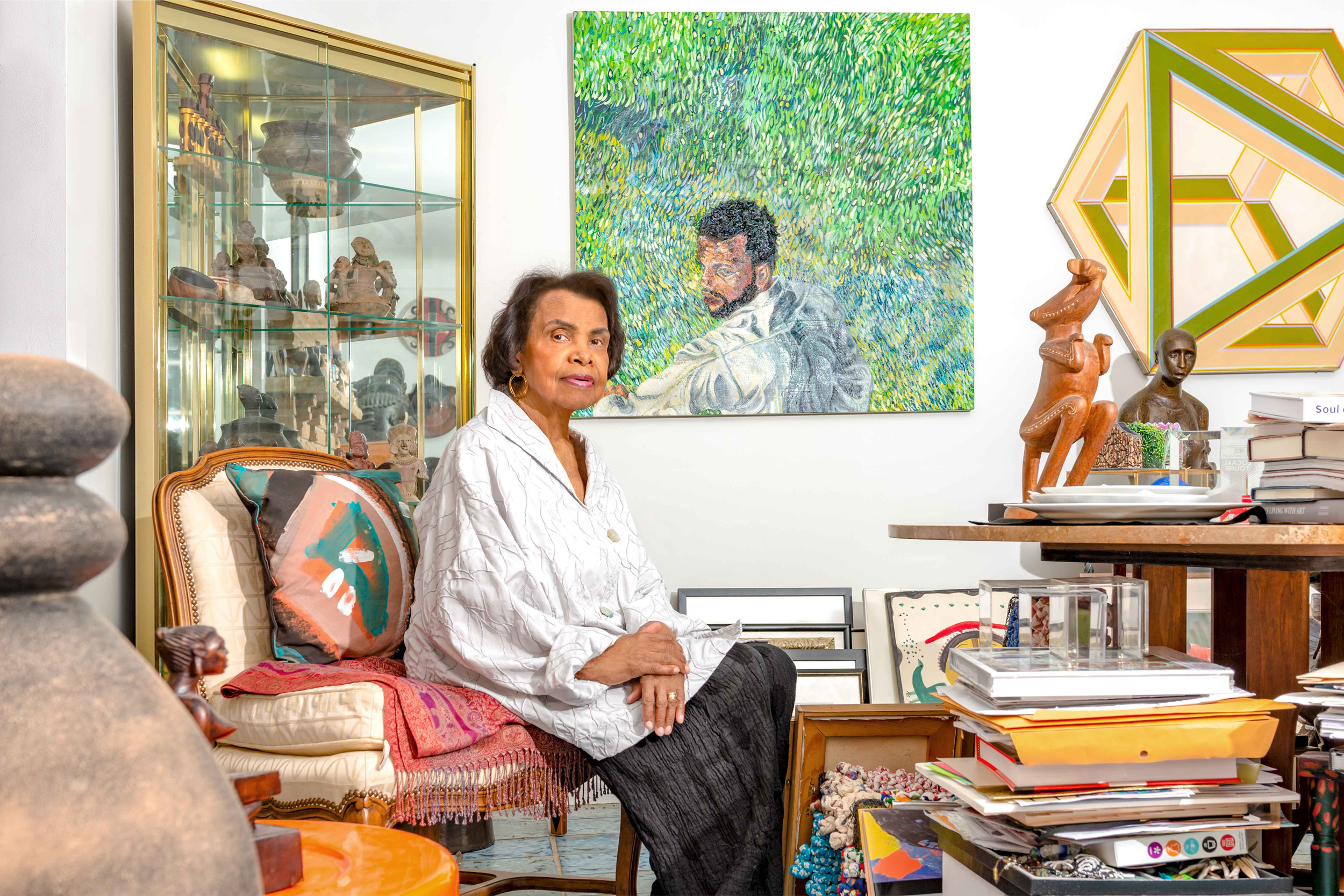 Shirley Woodson, born in 1936 in Pulaski, Tennessee, moved to Detroit with her parents at three months of age. She is a figurative painter whose practice includes drawing, collage and mixed media. Receiving her BFA and MA from Wayne State University she began her masters studies at the School of the Art Institute of Chicago in painting and art history. Woodson is known for her high-intensity colors and expressionistic painting style that lends itself to expanding ideas in drawing and mixed media. Woodson describes her work in literary terms: “Paintings are my diaries; Drawings are my prose; Collage is my poetry; Assemblages are my dialogue.” Besides her intense color exploration, other tonal subtleties appear in her mixed media and collage works. Her practice encompasses dual approaches in configuration.