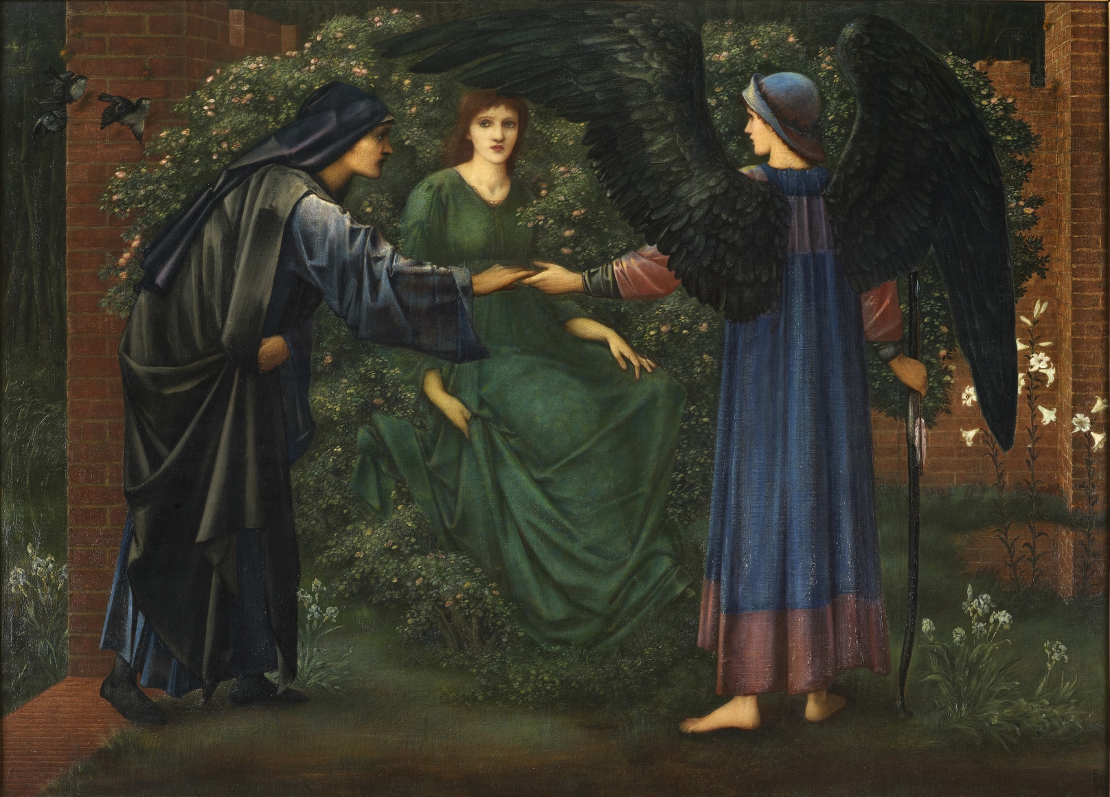 Sir Edward Coley Burne-Jones, 1st Baronet ARA (28 August 1833 – 17 June 1898) was an English artist and designer closely associated with the later phase of the Pre-Raphaelite movement, who worked closely with William Morris on a wide range of decorative arts as a founding partner in Morris, Marshall, Faulkner & Co. Burne-Jones was closely involved in the rejuvenation of the tradition of stained glass art in Britain; his stained-glass include windows in St. Philip's Cathedral, Birmingham, St Martin in the Bull Ring, Birmingham, Holy Trinity Church, Sloane Square, Chelsea, St Peter and St Paul parish church in Cromer, St Martin's Church in Brampton, Cumbria (the church designed by Philip Webb), St Michael's Church, Brighton, Trinity Church in Frome, All Saints, Jesus Lane, Cambridge, St Edmund Hall and Christ Church, two colleges of the University of Oxford. His stained glass works also feature in St. Anne's Church, Brown Edge, Staffordshire Moorlands and St.Edward the Confessor church at Cheddleton Staffordshire. Burne-Jones's early paintings show the heavy inspiration of Dante Gabriel Rossetti, but by the 1860s Burne-Jones was discovering his own artistic "voice". In 1877, he was persuaded to show eight oil paintings at the Grosvenor Gallery (a new rival to the Royal Academy). These included The Beguiling of Merlin. The timing was right, and he was taken up as a herald and star of the new Aesthetic Movement. In addition to painting and stained glass, Burne-Jones worked in a variety of crafts; including designing ceramic tiles, jewellery, tapestries, and mosaics.