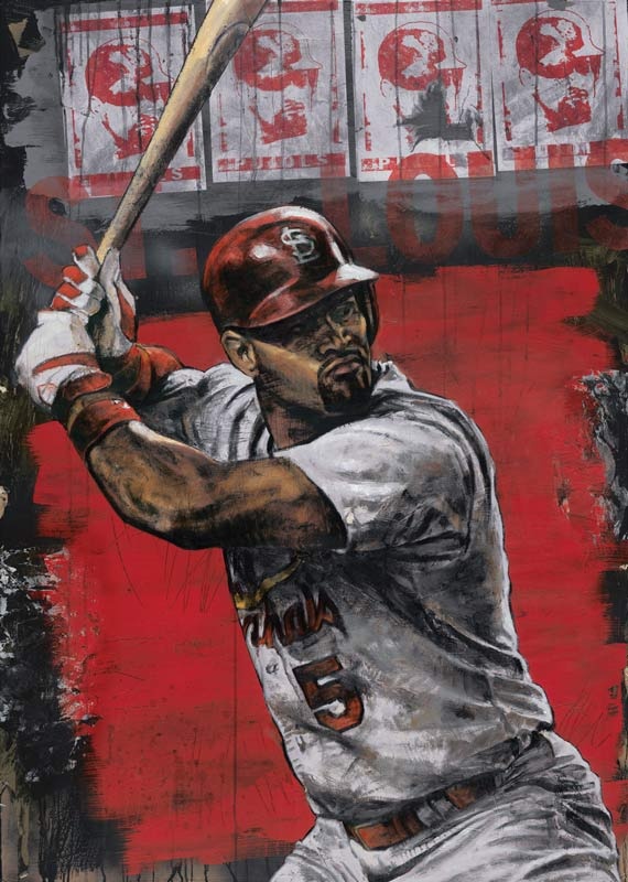 Stephen Holland painting style evolved from a signature black, white and gray, through a innovative interpretation of retro, to featuring the brighter colors of sports action. His backgrounds grew to include mixed media collages of acrylic paint, paper, stencil work and his original digital posters–– a texture which some confess, “subliminally impress the painting with sound.”