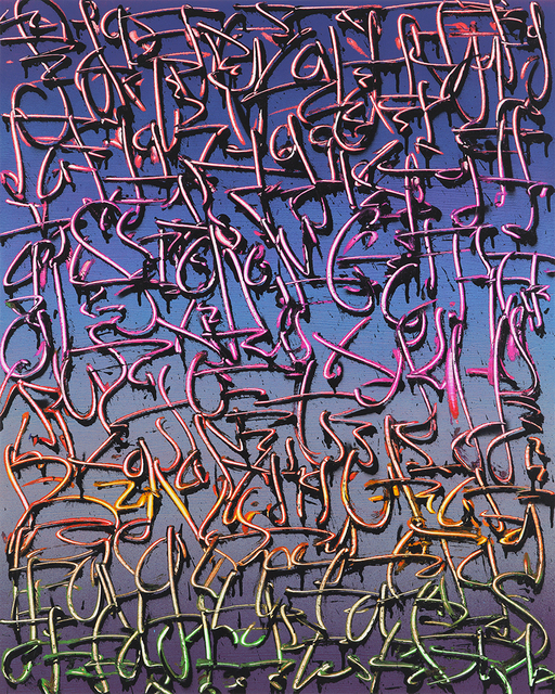 TANC is a former graphic designer who began to participate in the French graffiti community in 1996. Though he has since broadened his practice to include studio works, graffiti remains a strong influence—in fact, TANC continues to tag his canvases as he did his graffiti. His early works featured text elements, reflecting his interest in typographic design and calligraphy. Since then, TANC’s work has expanded to include compositions of pure abstraction, characterized by strong contours and geometric forms. His techniques include automatic writing, dripping his pigments, and spray painting. TANC also creates electronic music, a practice that influences his visual works, particularly in his applications of rhythmic marks or vibrating lines.