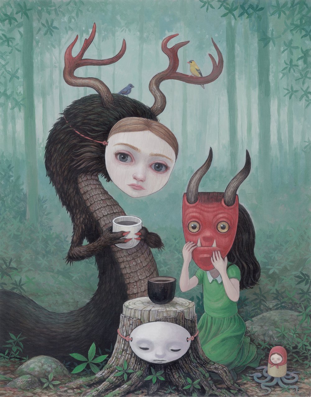 I honestly find the artist's statement to be an almost impossible feat. I am a visual artist, so, by my estimation, my entire job is to communicate without words; yet, here I sit trying to put words to my images, an exercise I am poorly prepared to undertake. Inspiration, for me, is just my accumulated experiences, things I've seen, heard, touched and felt through my life, jumbled about in my mind and abused by time until they show up on a piece of paper. I would love to point to a sketchbook of ordered images that would tell this story, but, as often as not, the images are spit out on scraps of envelopes near a computer or a convenient napkin ringed with coffee. Growing up in East Tennessee, I spent a great deal of my childhood wandering through the Smokies, especially the Chimneys Picnic Grounds on the Little Pigeon River. I passed many hours of many summers scrambling over rocks in the middle of streams and exploring caves and trails. The Smoky Mountains and the Little Pigeon River are the internal background to almost all of my work. No matter what the central element of a piece may be, the natural flora and fauna of the Smokies creeps in, whether in the obvious form of a Smoky Mountain songbird or salamander, or in the less obvious form of rhododendron leaves and lichen-covered boulders.