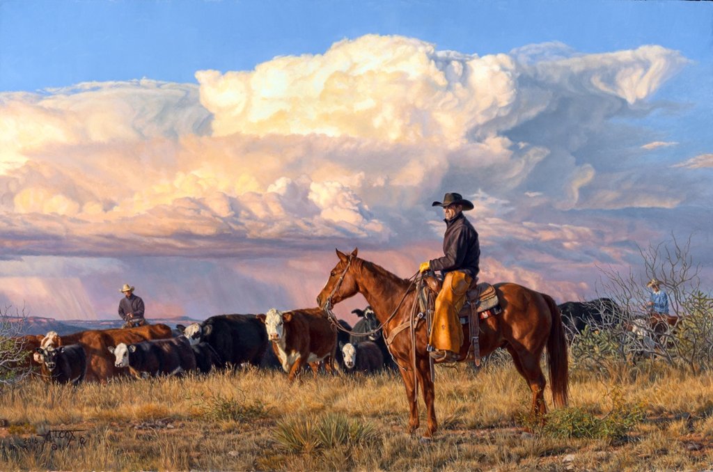 EXPERIENCE THE WEST through Tim Cox's eyes. Tim paints what he knows; vibrant cutting horses intent on holding that cow, cow ponies covered in sweat after working a hard day, ranch horses sharing a well earned drink at a glistening water trough. His cattle have authentic expressions; calves perhaps a little bewildered at a branding, bemused heifers waiting to be fed, a longhorn steer intent on leaving the country, or a herd just shuffling along as they are being driven to better pastures are frequent subjects. Ranchers, cutters, team ropers, or cowhands, all of them touch his heart. Add a striking landscape with dramatic skies; clear blue, wispy pink clouds or spectacular thunderheads and you have a Tim Cox painting.