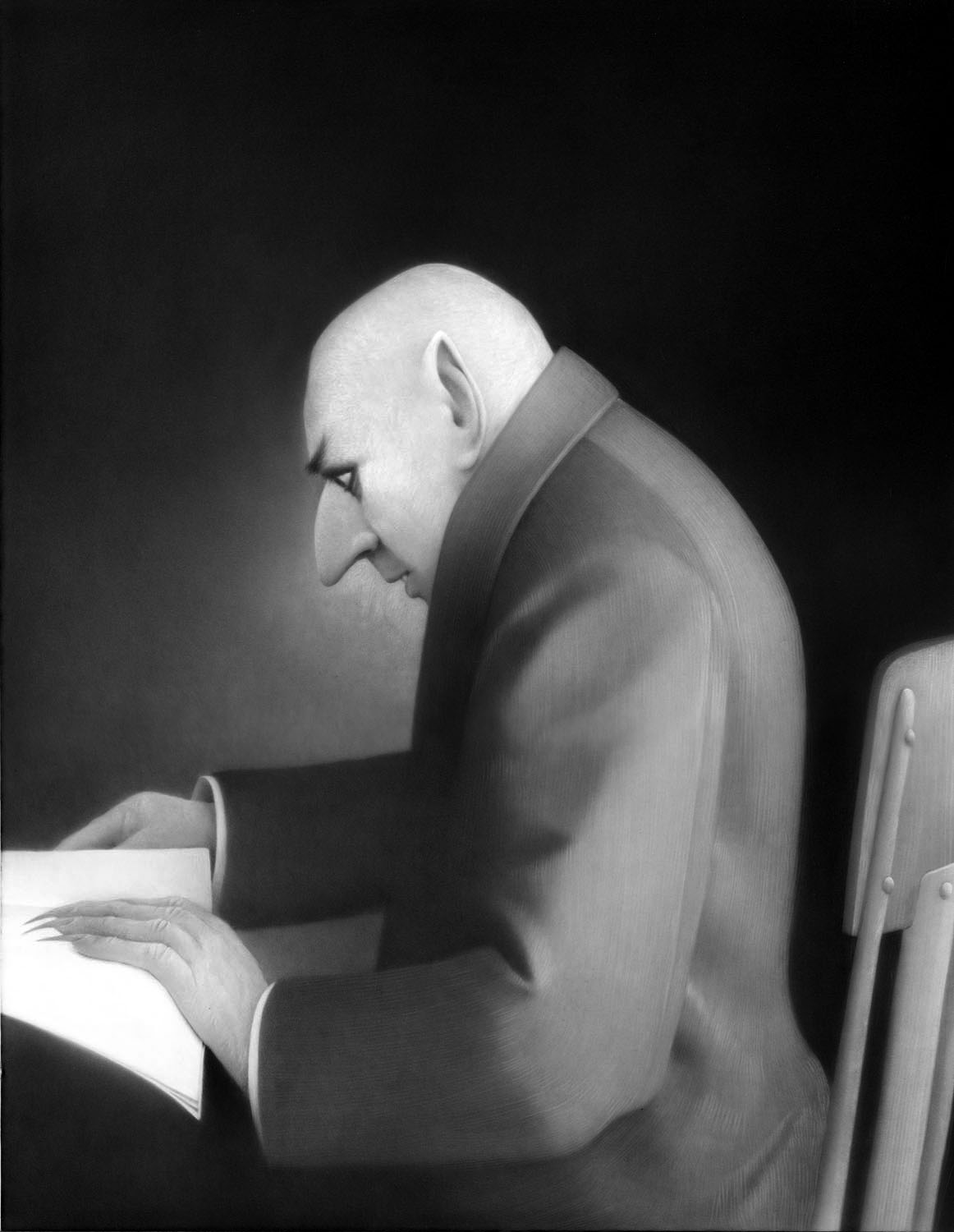 Travis Louie’s paintings come from the tiny little drawings and many writings in his journals. He has created his own imaginary world that is grounded in Victorian and Edwardian times. It is inhabited by human oddities, mythical beings, and otherworldly characters who appear to have had their formal portraits taken to mark their existence. The underlying thread that connects all these characters is the unusual circumstances that shape who they were and how they lived. Some of their origins are a complete mystery while others are hinted at. A man is cursed by a goat, a strange furry being is discovered sleeping in a hedge, an engine driver can’t seem to stop vibrating in his sleep, a man overcomes his phobia of spiders, etc, … Using acrylic paint washes and simple textures on smooth boards, he has created portraits from an alternative universe that seemingly may or may not have existed. His work is about identity and remembrance, with a veiled commentary on racism and the immigrant experience. He would like the fear of "the other" to be replaced with a curiosity about the unknown and a sense of wonder regarding those things that are unfamiliar.