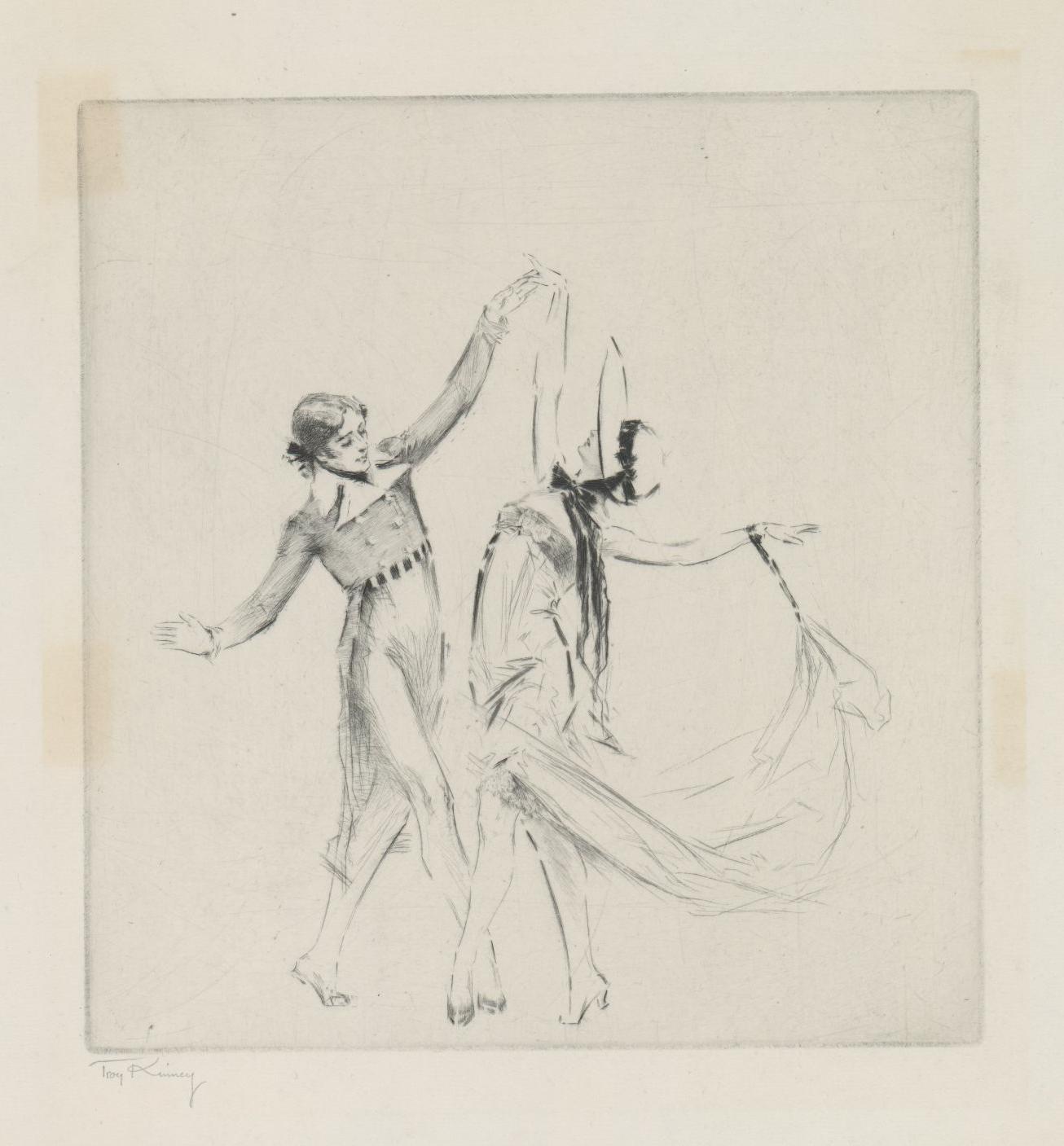 Troy Sylvanus Kinney (December 1, 1871 – January 29, 1938) was an American artist, etcher, and author. Troy Kinney was most notable for his works portraying dance performers, fanciful subjects, and classically styled nudes. He worked with dancers, including Ruth St. Denis, Anna Pavlova, and Sophie Pflanz among others. His artistic works are part of the collections of the Art Institute of Chicago, the Cleveland Museum of Art, the New York Public Library, the Library of Congress, and many others. Troy Sylvanus Kinney was born the son of William and Mary Kinney in Kansas City, Missouri. He attended Yale University, graduating in 1896, and then after a brief time illustrating for newspapers in the Baltimore, Maryland area, he moved to study at the Art Institute of Chicago, where he would later become a full member of the Chicago Board of Etchers. He met and in 1900 married his wife and collaborator Margaret West Kinney (1872–1952).[citation needed] They were premier illustrators of the early 20th century, creating works together under the name "The Kinneys", including scores of books, and covers for Harper's Bazaar magazine. Perhaps Troy Kinney's greatest legacy is in his contributions in the area of dance. He co-authored with his wife the books "Social Dancing of Today" and "The Dance: Its Place in Art and Life", for which he traveled throughout the world to study various dance styles. It remains to this day one of the most comprehensive works on the subject. Besides being a member of the Chicago Society of Etchers, Troy Kinney was a member of the Society of American Etchers, and the National Academy of Design. Troy Kinney died near his art studio in Falls Village, Connecticut, leaving his wife and only child, John West Kinney.