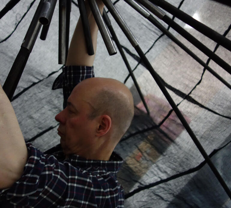 Vincent Tavenne was born in Montbéliard/France in 1961. He received the scholarship from Deutsch-Französisches Jugendwerk (1987), the Piepenbrock scholarship for young artists for sculpture (1998) and the Villa Romana Prize, Florence (1999). His works include, among other things, expansive, often textile sculptures, but also wooden sculptures – some of which can be walked on –, display cases, objects made of papier-mâché, large-format woodcuts and small-format watercolors. He is represented in numerous private and public collections. Vincent Tavenne lives in Berlin.