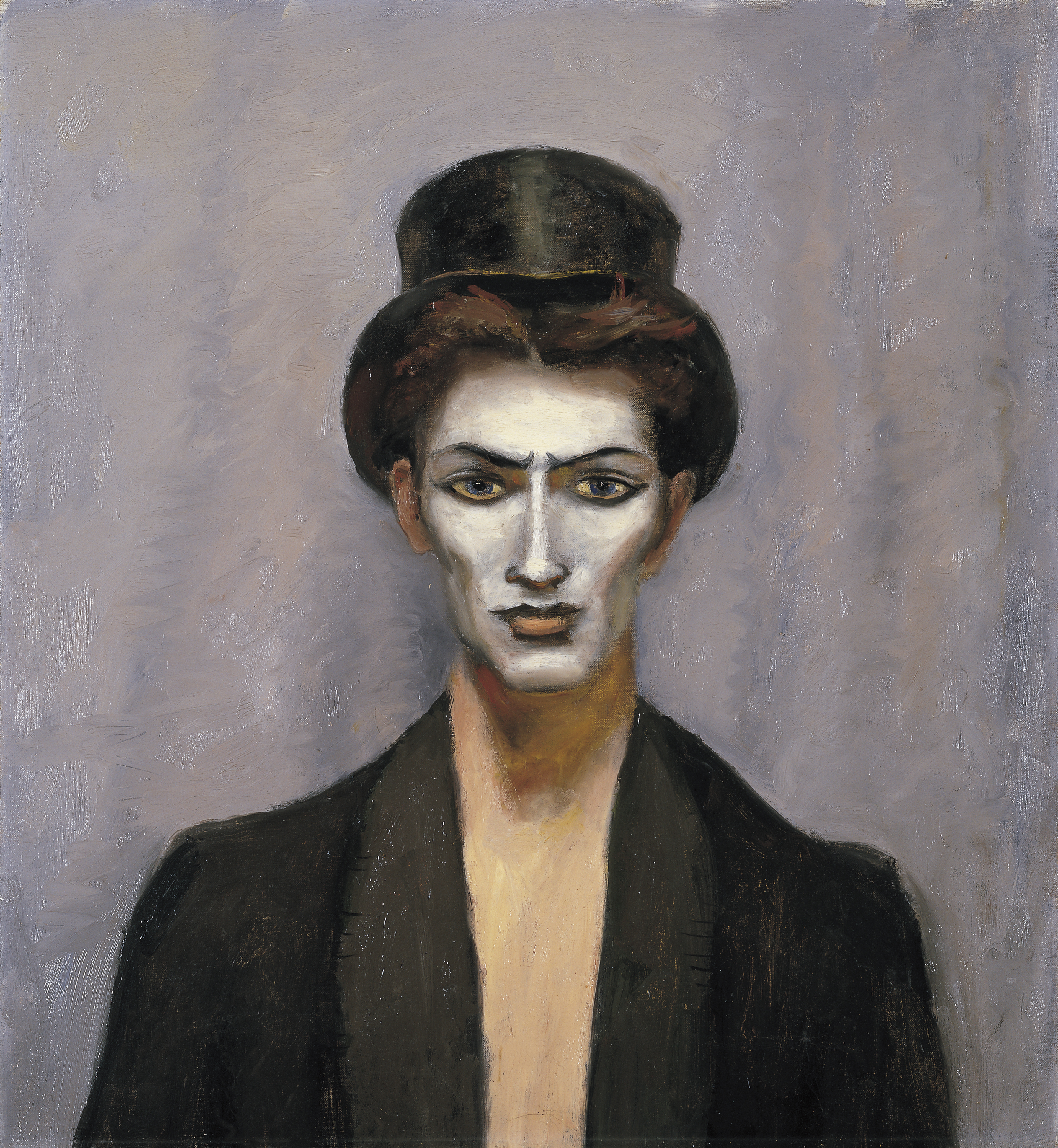 Over the next decade, Kuhn experimented with a number of modern styles—including cubism and fauvism—as well as a variety of mediums. In 1925, following a brush with death caused by a duodenal ulcer, Kuhn devoted himself to developing a style of his own. He returned to Europe to study old master paintings and ancient art and minimized his involvement in other activities. By the end of the decade his signature portrait technique had emerged: Kuhn boldly rendered single figures against stark backdrops. His subjects—burlesque and vaudeville performers, circus acrobats, and clowns—reflected his love for the circus and the stage. Despite the colorful costumes and staged poses of his sitters, Kuhn’s portraits are dignified and psychologically probing. The artist also painted many still lifes in a similarly bold, geometric manner.