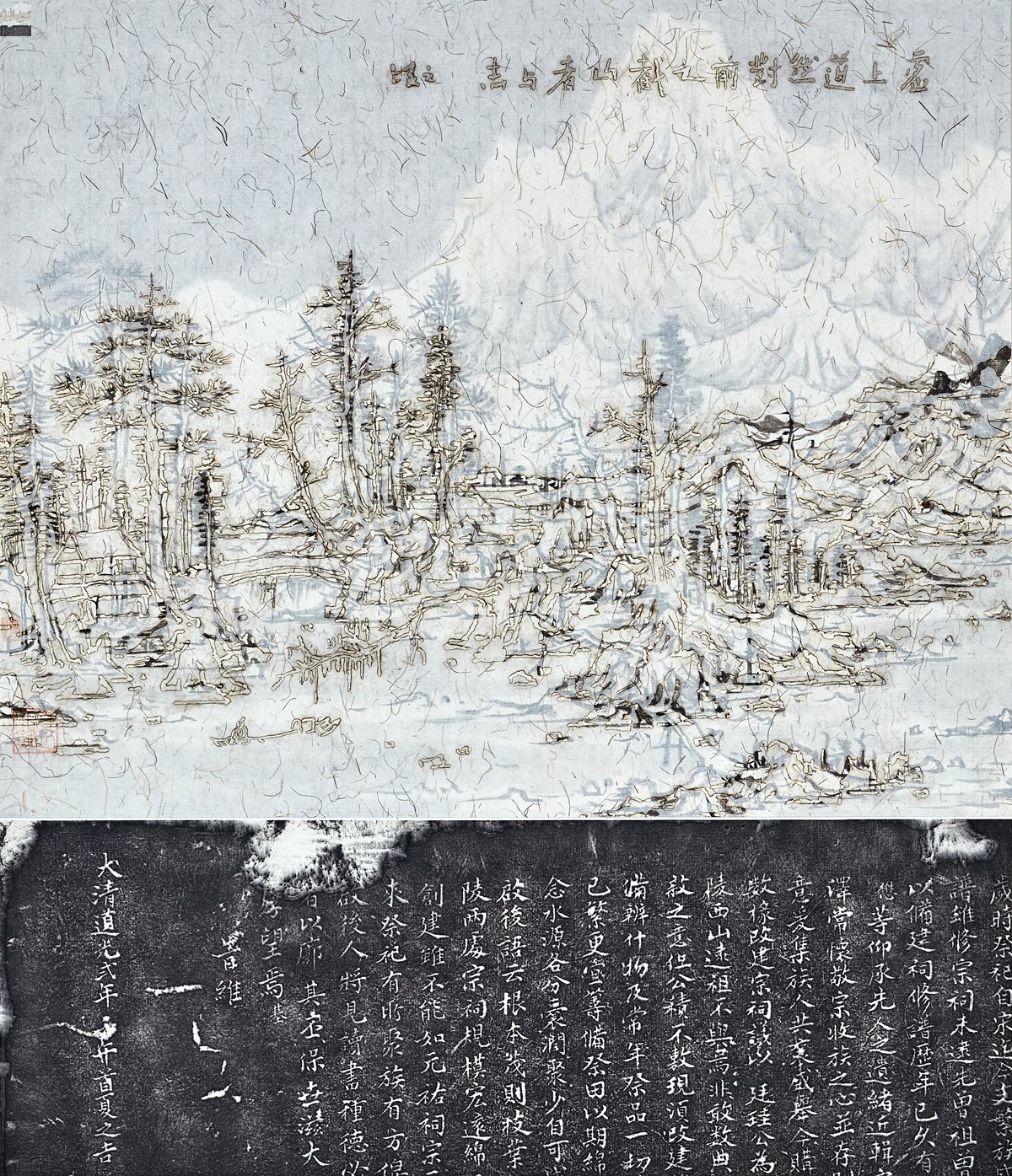 Born in Shanghai in 1960, Wang Tiande is one of the most innovative calligraphers in China: he recently created calligraphic works by the planting of new grass or by having sheep eat grass away in the shape of characters. A graduate of the Chinese Painting Department at the Zhejiang Academy of Fine Arts in 1988, he is now dean and professor at the Art and Design Department at Fudan University in Shanghai. Wang’s art is a serious meditation on the precarious relation between permanence and fleeting efflorescence, between the material and the immaterial, between past and present, between tradition and contemporaneity. He started to create his Digital series when he was on an artist’s residency in Paris in 2002. His direct encounter with contemporary art, especially conceptual art, in Paris not only inspired him to new approaches in his own work but also further convinced him of his love for the language of ink. In the Digital series Wang Tiande paints landscapes and calligraphies onto xuan paper and then enriches the images with cigarette burns. Rich in form and content, this series goes beyond any boundaries dividing painting and calligraphy.