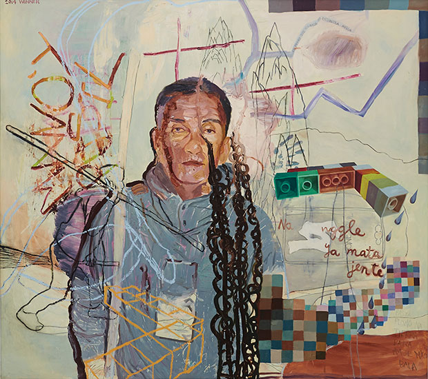When describing his works, Jumalon often talks about specific faces and spaces that inspire him. His body of work can be characterised by an ongoing exploration of personal, cultural and artistic identities, which are often fluid and interlinked. In Juramento, Filipino culture and history are explicitly linked with his own experiences and family history, in layered images populated by figures both real and mythical. In one painting, he associates an image of his mother tilling the soil with the origin myth of Zamboanga City’s Pasonanca district. In his series of three Juramentado paintings, Jumalon depicts himself as the titular Juramentado, an oath-bound Moro warrior from Filipino history, relating this striking figure to his own journey and convictions as an artist. With his constant references to Zamboanga City, one senses yet another oath in Jumalon’s works – one to his city of birth, to always remember and always return. Other works are grounded in contemporary figures. The painting Nuay Muerte (“No Death”) depicts a man who is known in Zamboanga City by the alias Mano’y Fusil (“hand of gun”). Jumalon explains, “According to rumours, Mano’y Fusil used to be a killer and is feared by everyone. He is a man of few words, and if anybody tried to quarrel with him or was plotting against him, he would immediately eliminate that person.” Yet, the artist acknowledges that this fearsome reputation is based entirely on unsubstantiated stories and rumours. Floating on the canvas is a colourful gun (fusil) made out of Lego blocks, a suggestion that our public selves can be constructed, invented, taken apart. As is typical of Jumalon’s works, seemingly random scribbles, sketches and broad strokes of paint interrupt the painted canvas like graffiti, further obscuring and throwing the man’s identity into question.