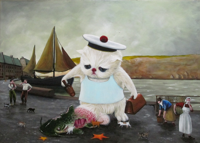 I was born near Montreal, Canada, in 1981. I grew up in several places in the country side where I probably forged my taste for woodlands and lonely spaces till I came back in town for teen aging. I have always drew in my childhood but now, after a BFA at UQÀM in 2005, ten years as a professional artist and many exhibitions of all kind, I can tell my work is more refined and is getting more poetic. The foundation of my inspiration stays the same and I go darker or happier depending on the mood. I am inspired by universal themes of human nature, sometimes obvious, sometimes more poetic, sometimes with accumulations of symbolic accessories and other flashy colors creating a disturbing sensation of tranquility in a black nothingness. In one way or another, my paintings are inevitable windows of interpretation from which one does not return indifferent. The canvas is crafted to be the smoothest, most often on a black base that the thick layer of polish filled to create an intense depth and bring out all the subtlety and softness of textures and colors.