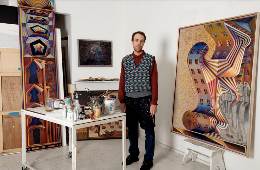 Zach Harris’s carved panel paintings unfold complex utopian and dystopian worlds. His psychedelic visions, which almost verge on abstraction, immerse viewers in the unfathomable depths of mysterious cosmologies. The art-historical density of his aesthetics is haunting, in a sense similar to that of late-nineteenth-century symbolism. While the bright coloring of his obsessively detailed paintings is reminiscent of the highly demanding ornamental quality of Persian miniatures, his intricate hand- or laser-engraved frames evoke the elaborate woodwork of Christian altarpieces. Harris is a fervent practitioner of meditation, and the meticulous repetition of painted or carved patterns and motifs within his compositions operates like a mantra. At the same time, it creates a hallucinatory play between the materiality of the relief and its optical illusion, bringing to mind the radial vibrancy and spiritual dimension of Tibetan mandalas. His syncretic art suggests timeless rituals, which, whether lost or prescient, have yet to be deciphered. Harris’s work is included in the collections of the Hammer Museum, Los Angeles and the San Francisco Museum of Modern Art, San Francisco, among others.
