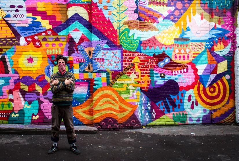 While Zosen paints on the streets frequently, his repertoire has expanded to include performance art, printmaking, illustration and fashion design. He has shown his work in galleries in Europe, the Americas and Asia and is the co-founder of the clothing label “Animal Bandido”. Relentlessly creative, Zosen constantly invents new artistic projects and urban interventions.