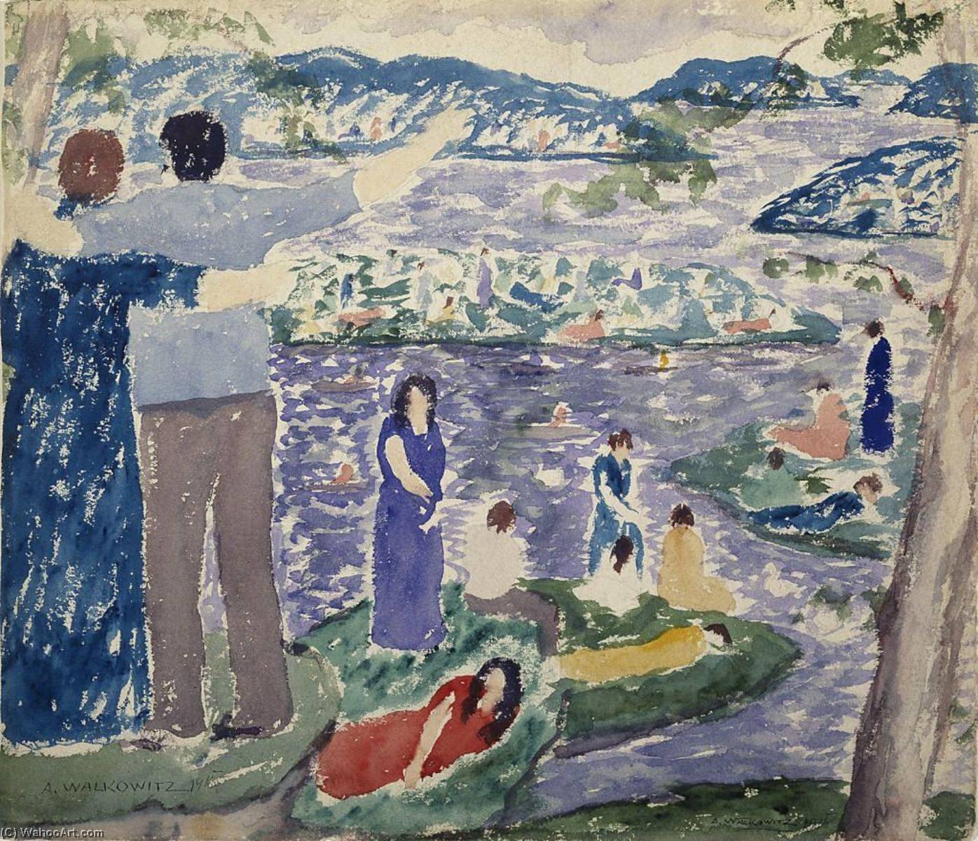 An early modernist painter known for abstract figurative works, especially in watercolor, Abraham Walkowitz was born in Siberia where his father, a lay rabbi and cantor, died while ministering in China to Jewish soldiers who had been conscripted into the Russian army. Fearful of persecution and the possibility of her son being drafted into the Czar’s army when he came of age, Walkowitz’s mother decided to emigrate with her children to the United States. En route across Europe, one of her three daughters died. The remaining family traveled steerage for twenty days across the Atlantic, finally settling in the Jewish ghetto of New York City where mother and son worked long hours at a newspaper stand to support the family. As a youth, Walkowitz studied the violin and drew continuously in chalk on any surface he could find. His formal art training began at age fourteen at the Artist’s Institute and continued at the National Academy of Design. His studies in life drawing, etching and painting, with concurrent study of anatomy at a Fifth Avenue hospital, resulted in precise, detailed renderings. He made drawings of ghetto life which were published in local newspapers. To earn money for a trip to Europe, Walkowitz taught art classes and painted signs. When his figurative work was criticized as being too subjective and realistic at a juried Academy exhibition, he perceived the criticism as narrow-minded and became all the more open to the avant-garde ideas he encountered in Europe.