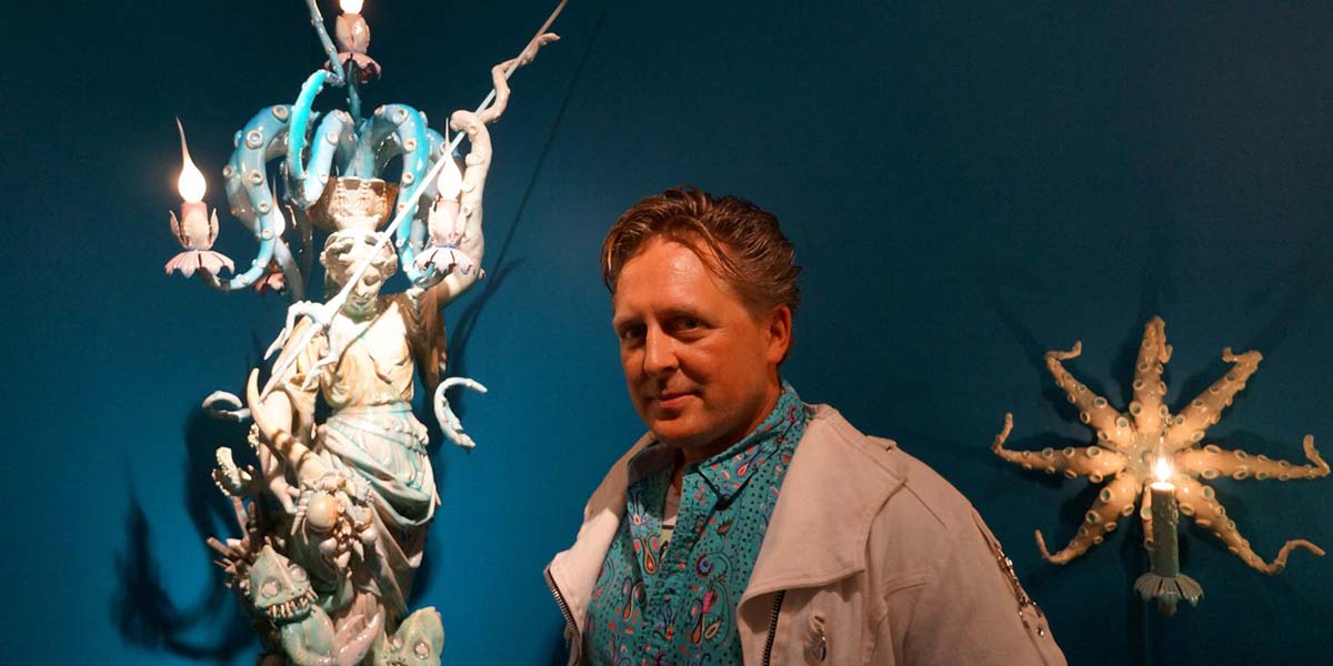 Adam Wallacavage was born in 1969. He currently lives and works in Philadelphia, Pennsylvania. He attended the University of the Arts in Philadelphia where he received a BFA in Photography in 1995. In 2001, Wallacavage taught himself the art of ornamental plastering and began making octopus shaped chandeliers. His chandeliers have been exhibited in galleries in São Paulo, Rome, London, Miami, Los Angeles, Vienna, ​and New York. In 2012, Wallacavage had a solo exhibition at the Philadelphia Art Alliance titled Shiny Monsters. His chandeliers have been featured in publications such as The New York Times, New York Times Magazine, New York Magazine and TIME Magazine. Beyond making sculptural works, Wallacavage is also an accomplished photographer. In 2006, Gingko Press published Monster Size Monsters, a book documenting fifteen years of his photography.