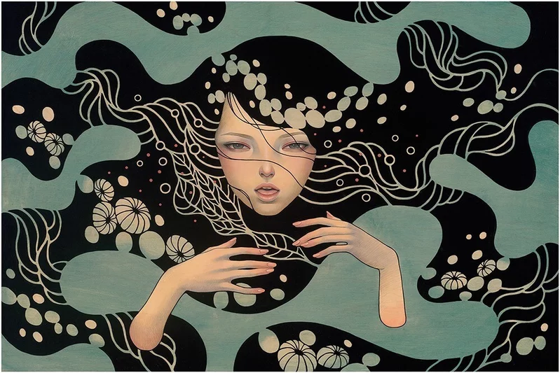 Audrey Kawasaki is a Japanese-American artist, born and raised in Los Angeles, where she currently lives and works. Kawasaki grew up reading Japanese manga comics, which inspired her to draw from an early age. She started taking after-school fine art classes at Mission Renaissance in her late teenage years. There she learned the basic foundation of drawing and painting. She attended Pratt Institute in New York after graduating high school, but left after two years without completion of degree. She started professionally showing at various art galleries in the US and internationally since 2005. Kawasaki’s work contains contrasting themes of innocence and eroticism, conveying the mysterious intrigue of feminine sensuality. Her sharp imagery is painted with precision onto wooden panels, the natural grain adding warmth to her enigmatic subject matter. The artist’s creative influences include eastern as well as western traditions such as Art Nouveau and Japanese Manga comics. She paints sultry, seductive and uninhibited female subjects with delicate beauty and provocative, direct eye contact. Their graceful gestures and ghost-like features carry mysterious expressions of melancholy and longing. Audrey likes noodles, broth, audiobooks, video games, dancing, the paranormal, and white wine spritzers.