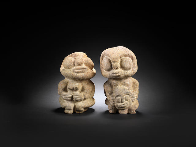 Once a carpenter, Buraimoh Gbadamosi (b. 1936) became one of the principal sculptors for the Oshogbo shrines. Friend and neighbor Suzanne Wenger hired him to do some carpentry and then convinced him to try relief carving. After two years, Gbadamosi began to carve wood in the round. Eventually he turned his talents to stone, the medium he is best known for today. His figures are solid and columnar works with round heads and large round eyes. Wenger describes his creations as reassuring and gentle old friends, noting that his smallest stonework represents the benevolent earth spirits, protectors of house and garden. The soft stone of these sculptures is a material sacred to Obatala, the Yoruba creator god. This fact, however, may have been irrelevant to Gbadamosi, who is both a Muslim and deeply involved in the Egungun masquerade cult that honors the ancestors.