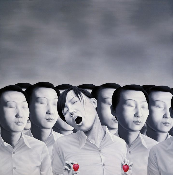 Trained in the art of engraving and having worked in the publishing industry, Chen Yu chose to become a painter to focus on creating a world of his own and to work by himself among his works, almost like traditional Chinese painters. Influenced by the art of printmaking, Chen Yu differentiates himself with the monotony of his subjects, which are cloned as if they were reproduced by the printing press. Rows of duplicated human heads are a constant symbolic feature in his paintings. Their repetition questions the place given to individuality and its expression. In some series of works, only one protagonist has his/her eyes open. The portraits repeat with boredom, with the figures looking detached from each other and forlorn, while among them one figure looks on. The artist’s sense of humour is perceptible in the way he illustrates individuality. The gestures or expression of the singled out character is most of the time hilarious. Sometimes picking one’s nose, water being poured on one’s bold head, looking at the spectator with a cigarette in one’s mouth, etc. are examples of such attitudes the artist picks to make one person among his created crowds stand out. Above the figures, a single motif absurdly floats in the composition, breaking this monotonous pattern by bringing the attention away from the human subjects. Over the years, his style and technique have matured into more realistic aesthetics, still crisp but with more accomplished renderings and a more subtle colour palette. In recent works, Chen Yu explores individuality in new ways, the difference between the characters are shown in gender, outfits, and facial expressions. The figures appear to be more related, less isolated and if one individual is distinguished, the others seem to interact with him or her - their eyes are open.